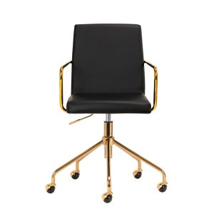 Przyjemne w dotyku, obicie ze skóry syntetycznej w odcieniach czerni nadaje meblowi wyjątkowego charakteru. Eleganckie wykończenie sprawia, że mebel przykuwa wzrok. Stelaż w odcieniach złota dodaje elegancji, idealnie komponując się z prostymi kształtami. Funkcjonalne kółka zapewniają znaczną mobilność, ułatwiając przestawianie krzesła oraz poruszanie się po salonie w trakcie pracy. Estetyka wykonania, komfort użytkowania oraz ergonomicznie wyprofilowane oparcie sprawiają, że krzesło spełni wymagania nawet najbardziej wymagających użytkowników.