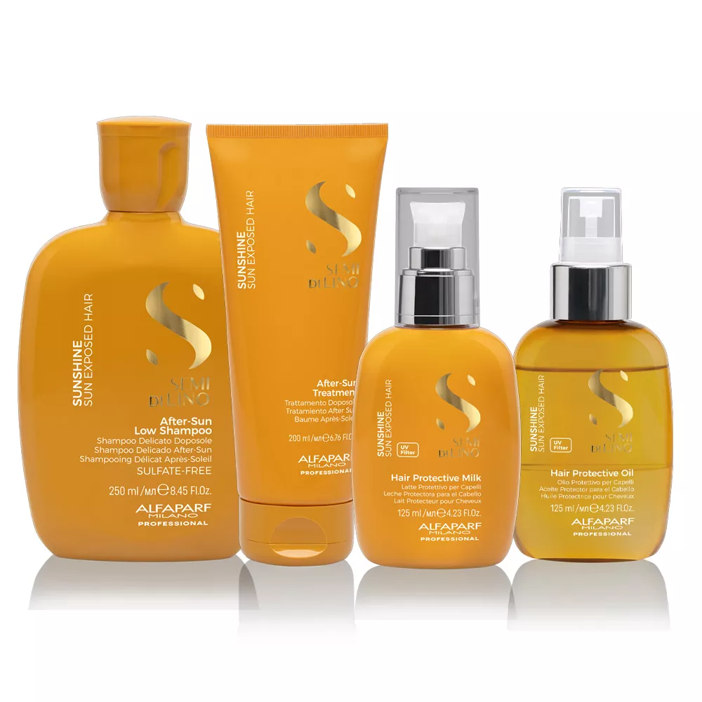 Alfaparf Semi di Lino Sunshine przeciwdziała uszkodzeniom wywołanym promieniowaniem UV, chlorowaną wodą z basenu i solą morską. Dzięki kompleksowi Sun Shield, tworzy barierę ochronną wokół włosa, zapobiegając oksydacyjnemu uszkodzeniu i utracie protein. Wzbogacony o olej z nasion Chia, produkt intensywnie odżywia włosy, wspierając ich regenerację po ekspozycji na niekorzystne czynniki zewnętrzne.