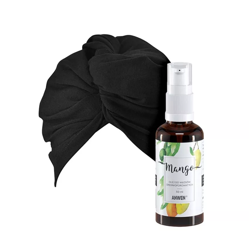 Specjalnie z myślą o włosach średnioporowatych przygotowaliśmy praktyczny zestaw do olejowania włosów Anwen. W zestawie otrzymujesz turban oraz olej w buteleczce z pompką.Olej Mango Anwen odżywia pasma i poprawia ich elastyczność. Dodatkowo niezwykle przyjemnie, owocowo pachnie, dzięki czemu aplikacja kosmetyku jest bardzo przyjemna. Wygodny sposób dozowania to kolejny atut tego preparatu. Turban doskonale trzyma się na głowie, a pętelka ułatwia jego "zawiązanie". Przyda się przy olejowaniu, ale również codziennej pielęgnacji, ploppingu czy podczas suszenia włosów