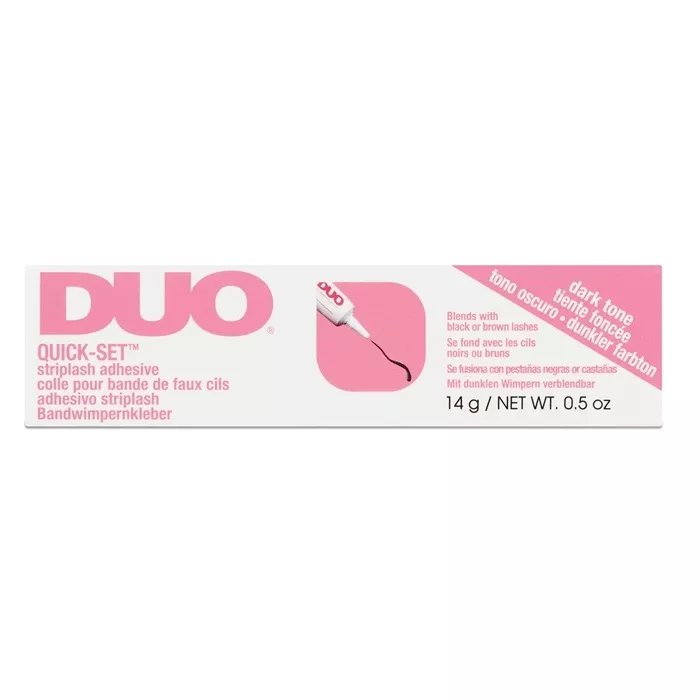 Ardell Duo Quick Striplash Adhesive klej do rzęs Dark 14g to jeden z najlepiej sprzedających się na świecie klejów do rzęs. Dzięki niemu, bez wysiłku, możesz nałożyć swoje ulubione rzęsy w zaledwie kilka sekund! Elastyczna, lateksowa formuła została stworzona z myślą o aplikacji sztucznych rzęs na pasku i taśmie. Produkt jest wodoodporny i szybkoschnący, co gwarantuje doskonałą przyczepność rzęs.