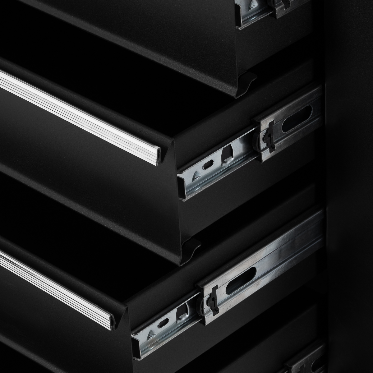 Model wyposażony jest w pięć pojemnych szuflad, co zapewnia dużo miejsca na niezbędne narzędzia, środki higieniczne oraz jednorazowe akcesoria. Przemyślany układ sprzyja zachowaniu porządku i odpowiedniej organizacji przestrzeni roboczej. Zamek z kluczem zabezpiecza szuflady przed niekontrolowanym wysuwaniem i umożliwia przechowywanie delikatniejszych elementów wyposażenia lub dokumentacji.