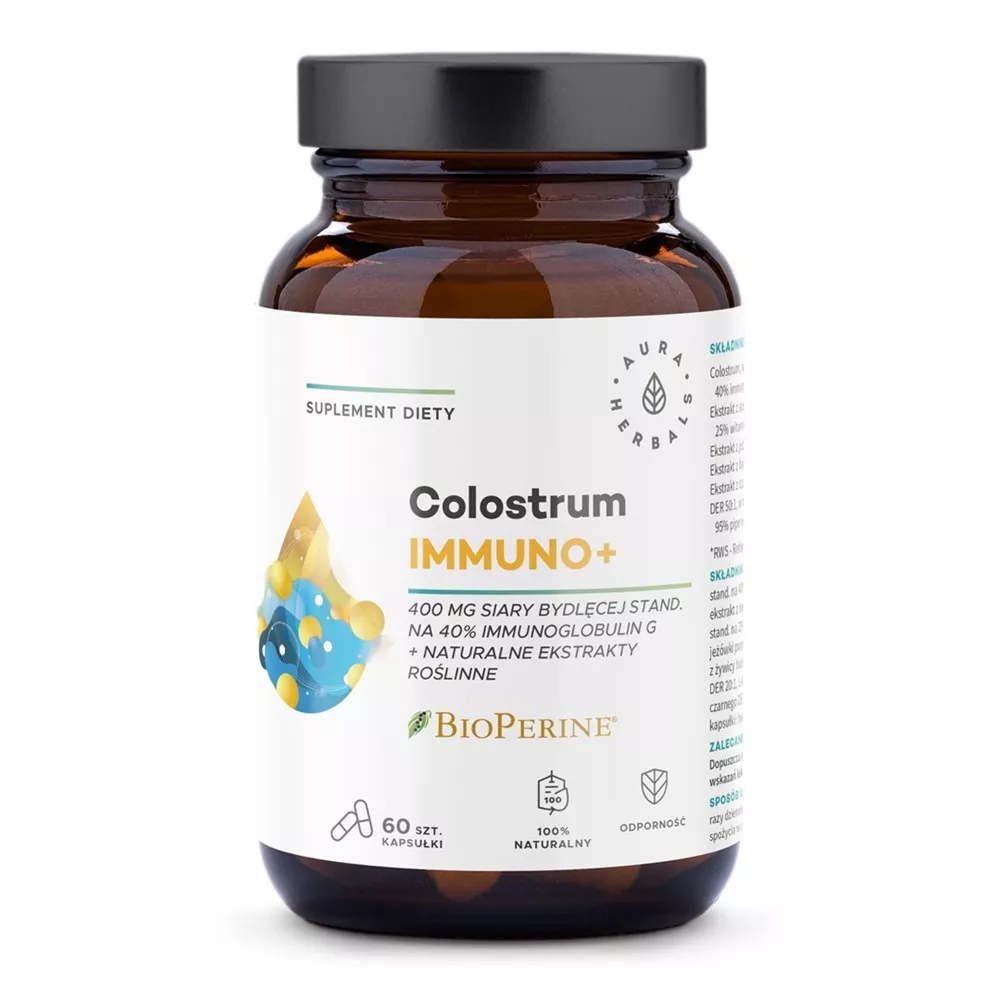 Aura Herbals Colostrum Immuno + BioPerine to wysokiej jakości suplement diety w postaci kapsułek, który został stworzony z myślą o wsparciu Twojego układu odpornościowego. Każda kapsułka zawiera 350 mg colostrum, czyli siary bydlęcej, standaryzowanej na 40% immunoglobulin G, oraz markowy ekstrakt BioPerine z czarnego pieprzu, standaryzowany na 95% piperyny. Produkt jest w 100% naturalny, a jego skład jest prosty i pozbawiony zbędnych dodatków.