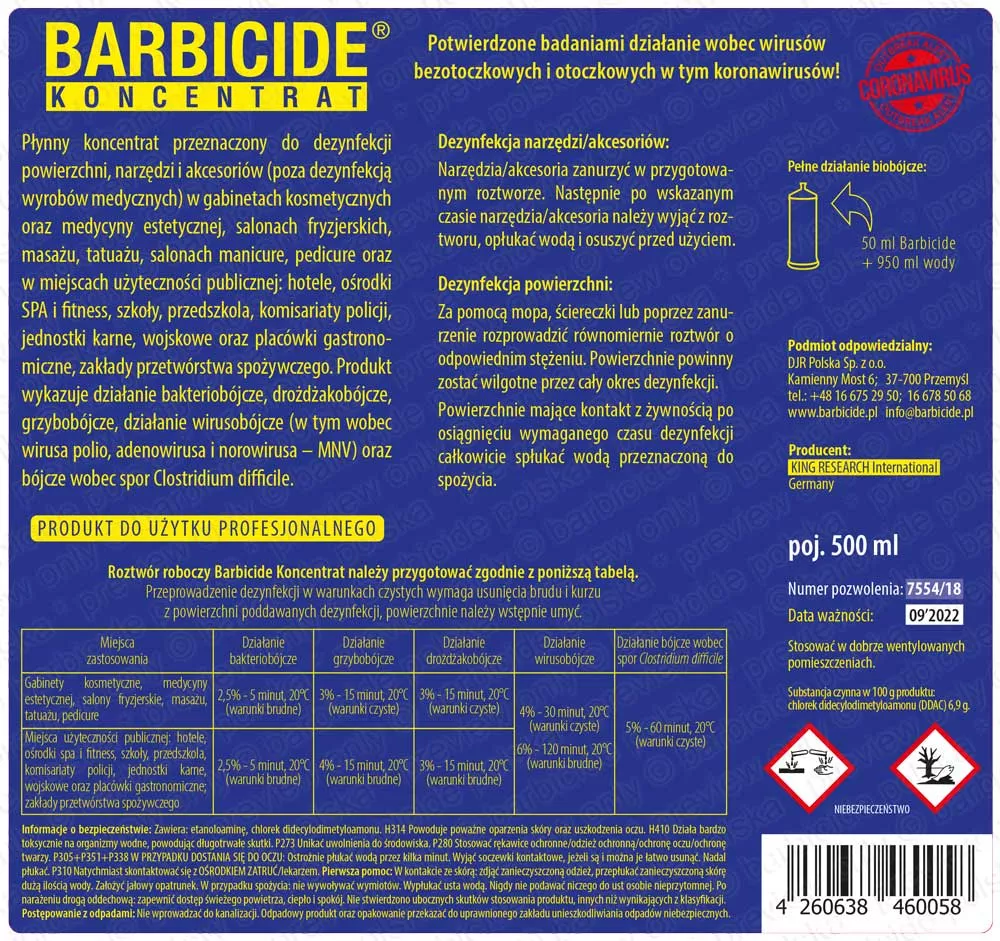 Aby uzyskać optymalne efekty dezynfekcji, zmieszaj koncentrat Barbicide z wodą w proporcji 1:16 (60 ml koncentratu na 1 litr wody). Zanurz narzędzia w przygotowanym roztworze na minimum 3 minuty, maksymalnie 10 minut. Preparat można stosować również w myjkach ultradźwiękowych.