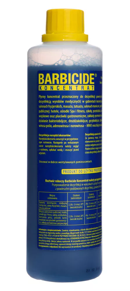 Zmieszaj koncentrat Barbicide z wodą w proporcji 1:16 (60 ml koncentratu na 1 litr wody). Zanurz narzędzia w przygotowanym roztworze i pozostaw na minimum 3 minuty, maksymalnie 10 minut. Po dezynfekcji narzędzia należy opłukać wodą i osuszyć.