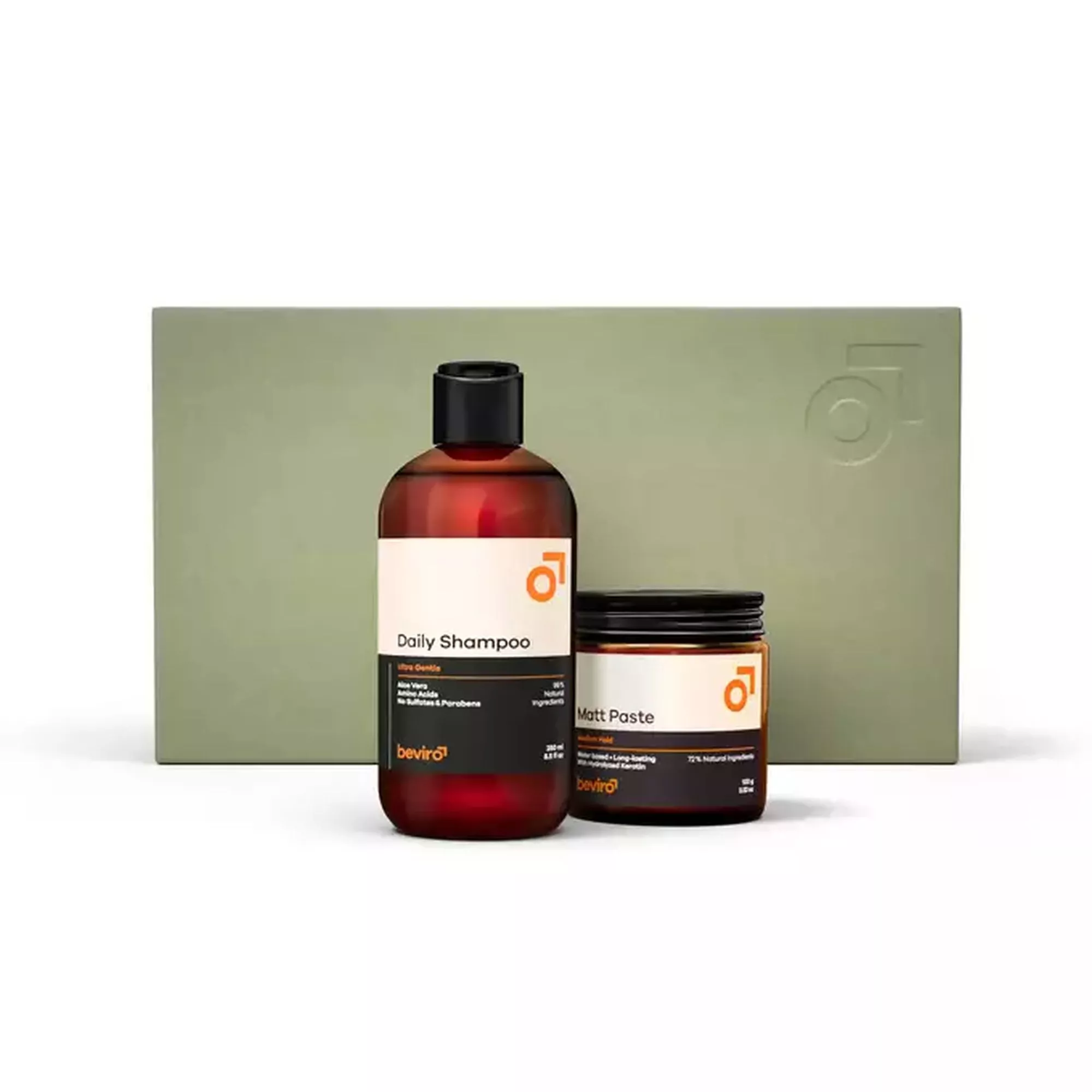 Zestaw do pielęgnacji i stylizacji włosów marki Beviro to idealny prezent dla osób dbających o swoje włosy. W środku znajdziesz pastę do włosów o matowym wykończeniu i średnim chwycie, doskonałą do większości krótszych fryzur, oraz szampon do codziennego użytku.