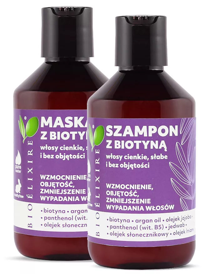Zestaw do pielęgnacji włosów Bioelixire z biotyną wzmacnia i odbudowuje delikatne włosy, pozbawione blasku i objętości. Maska regeneruje kosmyki, ogranicza nadmierne wypadanie, odżywia włosy i wspiera ich porost. Ponadto włosy są grubsze, wydają się bardziej gęste i zdrowsze. Pięknie lśnią i są miękkie w dotyku. BIOTYNA wpływa na zachowanie prawidłowej kondycji włosów i skóry głowy. Hamuje wypadanie włosów oraz zapobiega ich siwieniu. Ogranicza nadmierną aktywność gruczołów łojowych. PANTENOL (WITAMINA B5) stymuluje wzrost włosów oraz przyczynia się do ich wzmocnienia. Nadaje włosom sprężystości, a także zwiększa ich zdolność do absorpcji i utrzymania wody. Pobudza cebulki aktywując wytwarzanie keratyny. OLEJEK ARGANOWY uważany jest za płynne złoto Maroka. Zawiera kwasy tłuszczowe Omega 3, 6, 9 oraz witaminę E.