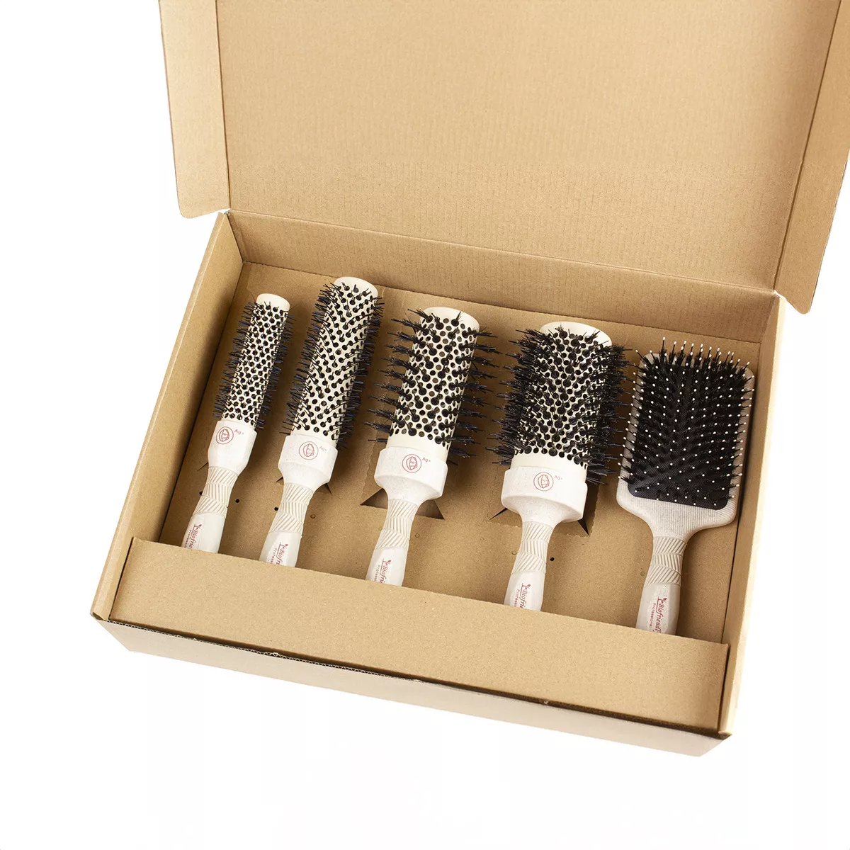 Wykonane z odpornego na wysokie temperatury do 110oC biomateriału ze słomy pszenicznej, który redukuje emisję dwutenku węgla. Technologia Nano-Icon: usuwanie nieprzyjemnego zapachu, sterylizacja i zapobieganie powstawaniu pleśni. Miekkie i ergonomoczne uchwyty zapewniające wygodę pracy, a niewielka waga szczotek ułatwia stylizację włosów. Szczotki szybko nagrzewają się i dłużej utrzymują ciepło. Duże otwory przyspieszają cyrkulację powietrza podczas suszenia. Wszystkie szczotki posiadają szpikulce ułatwiające dzielenie pasm włosów i tworzenie sekcji. Korpusy szczotek pokryte powłoką ceramiczną