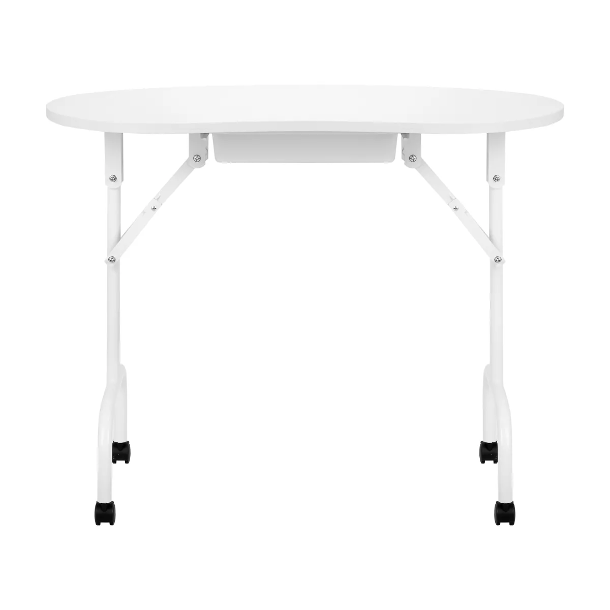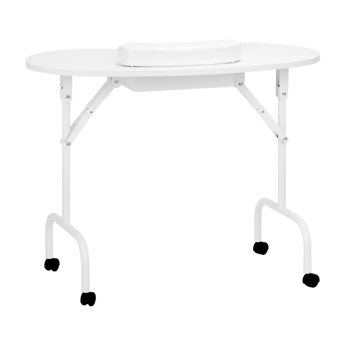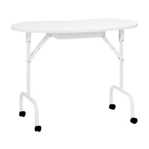 Niewielkie rozmiary złożonego stolika pozwalają na łatwe przechowywanie oraz komfortowy transport mebla, co jest kluczowe w przypadku usług mobilnych. Pod blatem znajduje się miejsce na kuwetę, w której można ułożyć wszelkie najpotrzebniejsze produkty i akcesoria. Taka szufladka zapewnia łatwy dostęp do niezbędnych podczas pracy narzędzi. Poduszka do manicure uefektywnia przeprowadzanie zabiegów, pozwalając klientowi na przyjęcie odpowiedniej, komfortowej pozycji. Biurko jest łatwe do składania, co znacząco wpływa na wygodę użytkowania. Dołączona do zestawu wytrzymała torba świetnie sprawdzi się w trakcie transportu mebla, ułatwiając jego przenoszenie oraz chroniąc przed uszkodzeniami.