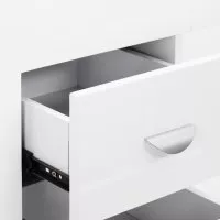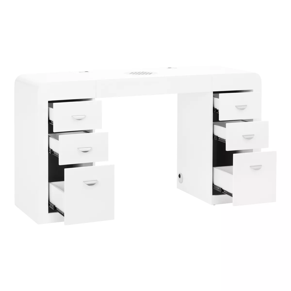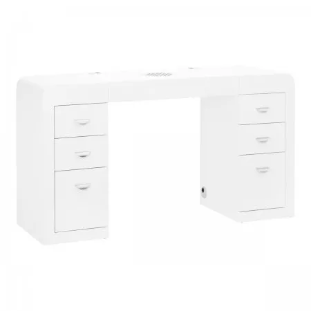 Szafki po obu stronach z trzema pojemnymi szufladami znacznie ułatwiają organizację oraz utrzymanie porządku w najpotrzebniejszych kosmetykach i narzędziach. Dzięki temu niezbędne produkty zawsze znajdują się pod ręką, co przekłada się na efektywność pracy. Biurko ma specjalne otwory w blacie do przeprowadzania kabli od niezbędnych urządzeń, co pozwala na łatwe utrzymanie porządku i estetyki stanowiska pracy.