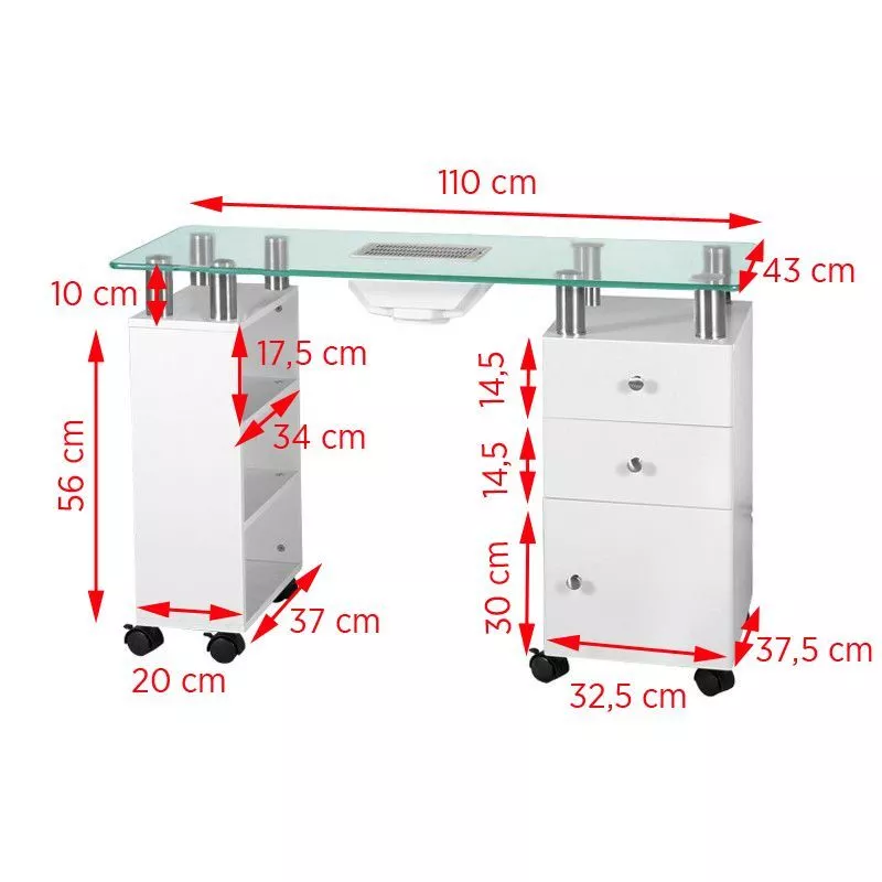 - Elegancja: Kilkunastocentymetrowe podwyższenie pod blatem z hartowanego szkła dodaje nowoczesnego wyglądu i jest idealne do zabiegów manicure.