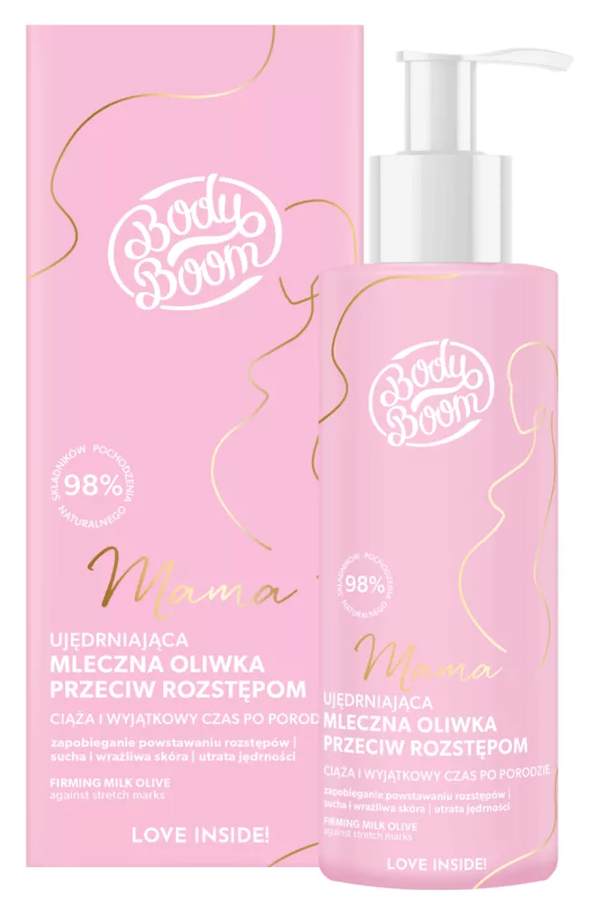Jestem naturalną (98% składników pochodzenia naturalnego wg normy ISO 16128) ujędrniającą mleczną oliwką na bazie wegańskiej receptury. Zatroszczę się o Ciebie w wyjątkowym okresie ciąży i po porodzie przywracając Twojej skórze elastyczność, jędroność i wspierając ją w walce z rozstępami.