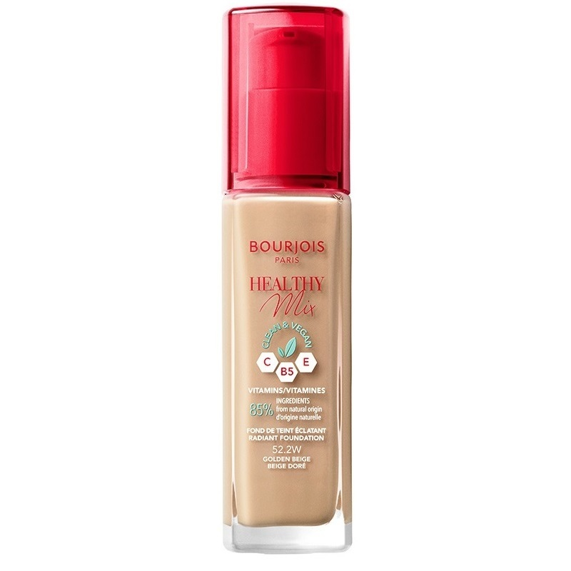 Odkryj wegański podkład Bourjois Healthy Mix Clean w odcieniu 52.2 Golden Beige. Ten rozświetlający podkład zawiera formułę z ponad 2 razy większą ilością witamin w porównaniu do poprzedniej wersji, co zapewnia zdrowy wygląd skóry i naturalnie promienną cerę. Dzięki lekkiej, beztłuszczowej konsystencji, produkt gwarantuje komfort noszenia przez cały dzień, oferując krycie od średniego do pełnego.