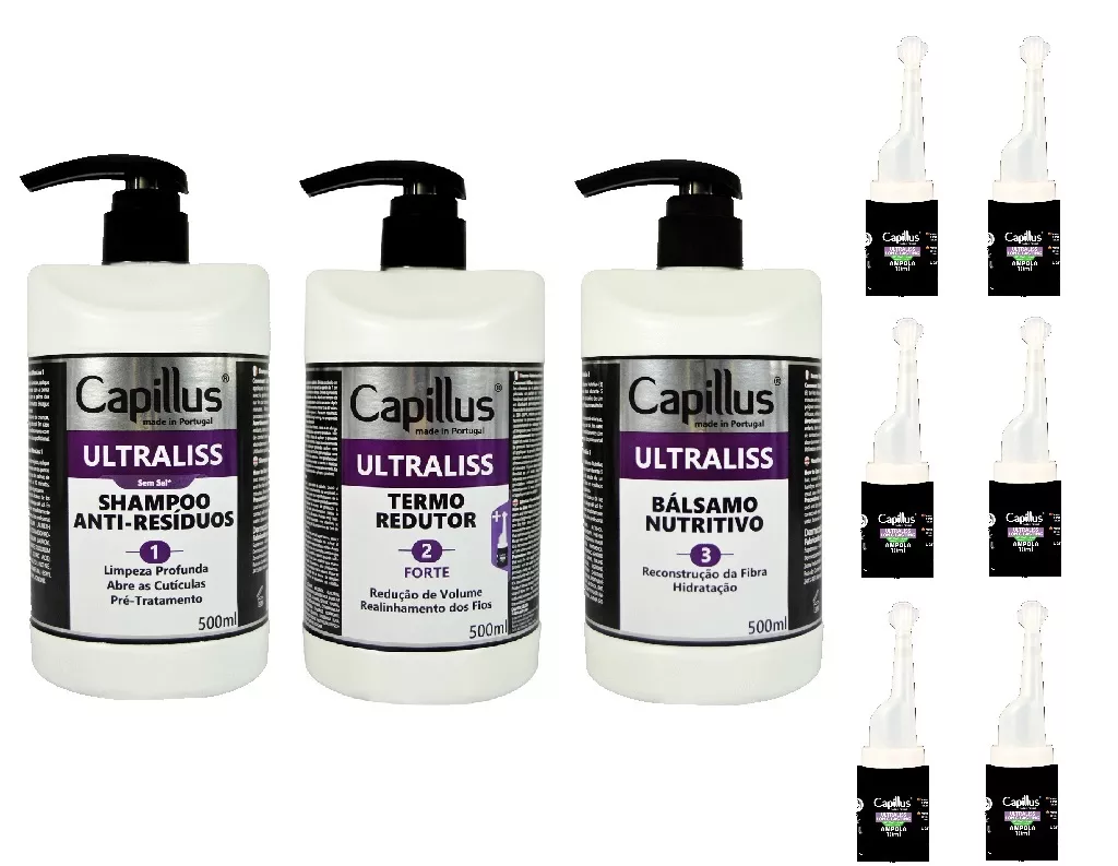 Zestaw Capillus Ultarliss Forte Professional Line to profesjonalna linia kosmetyków do progresywnego prostowania włosów z organicznym kwasem glioksalowym oraz keratyną oraz z kompleksem aminokwasów intensywnie wygładza włosy zmniejszając objętość przeciwdziałając puszeniu się włosów z efektem do 4 miesięcy.*