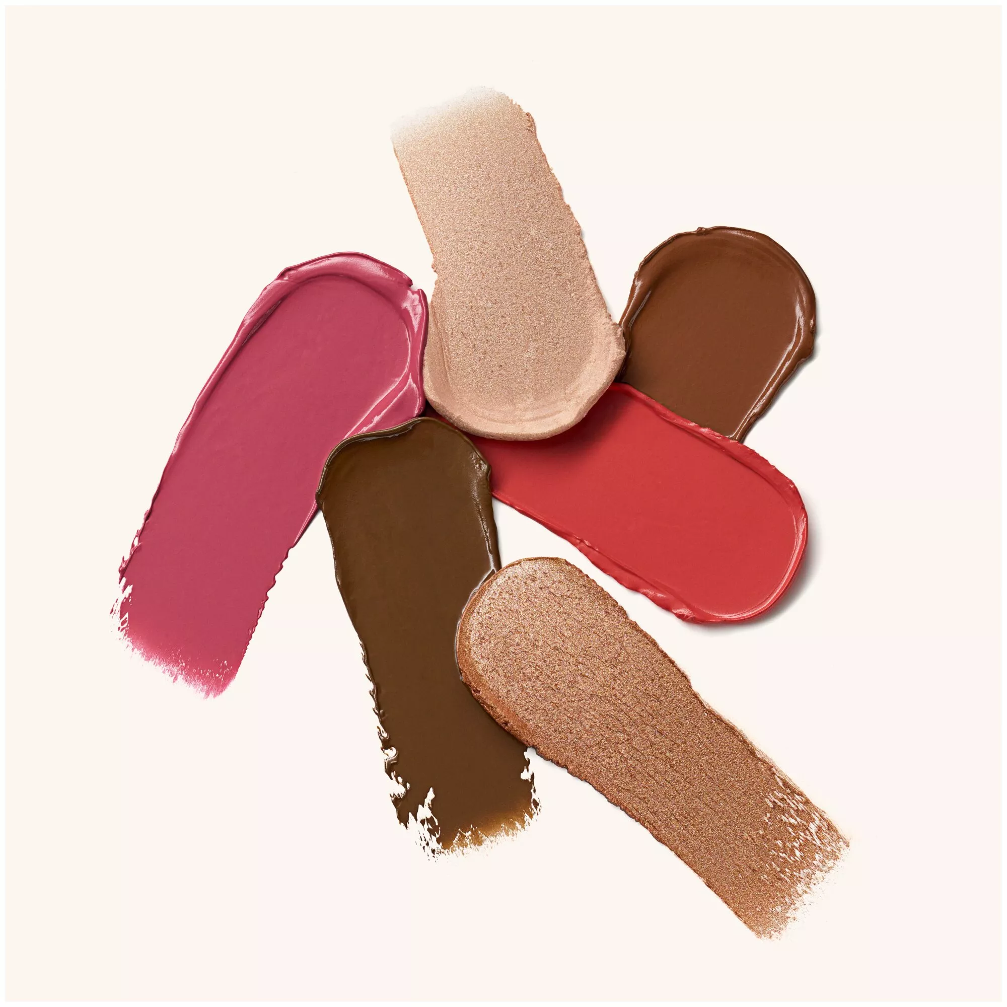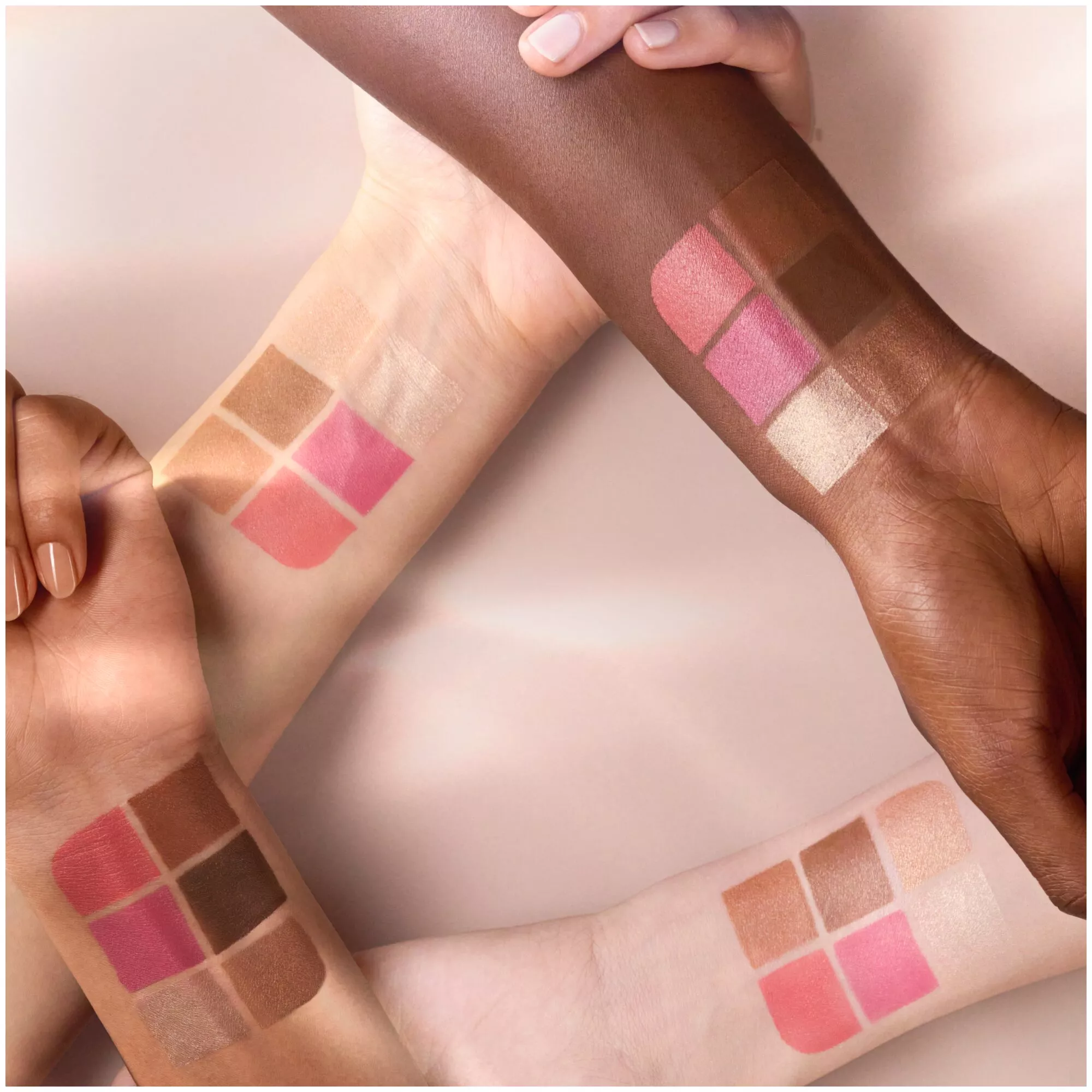 Produkty 1, 4, 5: Octyldodecanol, Triethylhexanoin, Synthetic Wax, Silica, Isononyl Isononanoate, Boron Nitride, Caprylic/capric Triglyceride, Tridecyl Trimellitate, Bis-diglyceryl Polyacyladipate-2, C20-40 Alcohols, Tocopheryl Acetate, Helianthus Annuus (Sunflower) Seed Oil, Tocopherol, Silica Dimethyl Silylate, Polyethylene, Methicone, Camellia Oleifera Seed Oil, Phenoxyethanol, Aluminum Hydroxide, May Contain/15850 (Red 6, Red 7 Lake), Ci 42090 (Blue 1 Lake), Ci 45410 (Red 28 Lake), Ci 77491, Ci 77492, Ci 77499 (Iron Oxides), Ci 77891 (Titanium Dioxide).