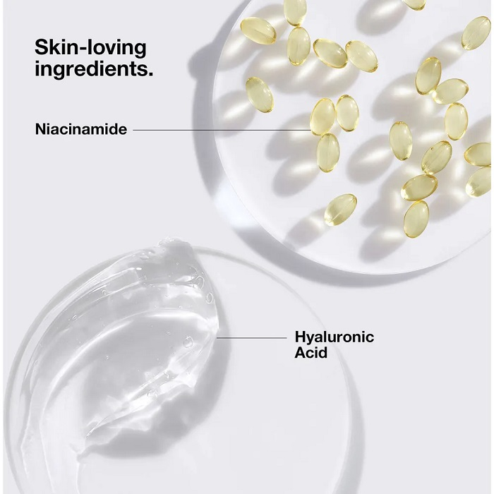- Formuła przyjazna dla skóry łączy niacynamid i kwas hialuronowy, aby zminimalizować widoczność porów, zmniejszyć wydzielanie sebum i błyszczenie oraz nawilżyć skórę.