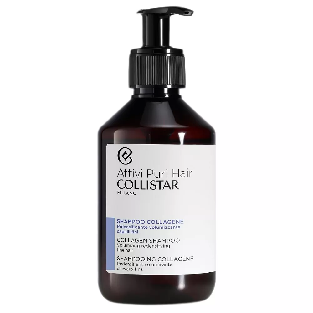 Collistar Attivi Puri Hair szampon do włosów z kolagenem to innowacyjny produkt, który wzbogaca pielęgnację włosów o roślinny kolagen - białko strukturalne, które zagęszcza cienkie włosy i dodaje im objętości poprzez zwiększenie średnicy łodygi włosa. Wzbogacony o roślinne białka, szampon ten zwiększa odporność i elastyczność włosów, jednocześnie zapewniając im nawilżenie i ochronę antyoksydacyjną.