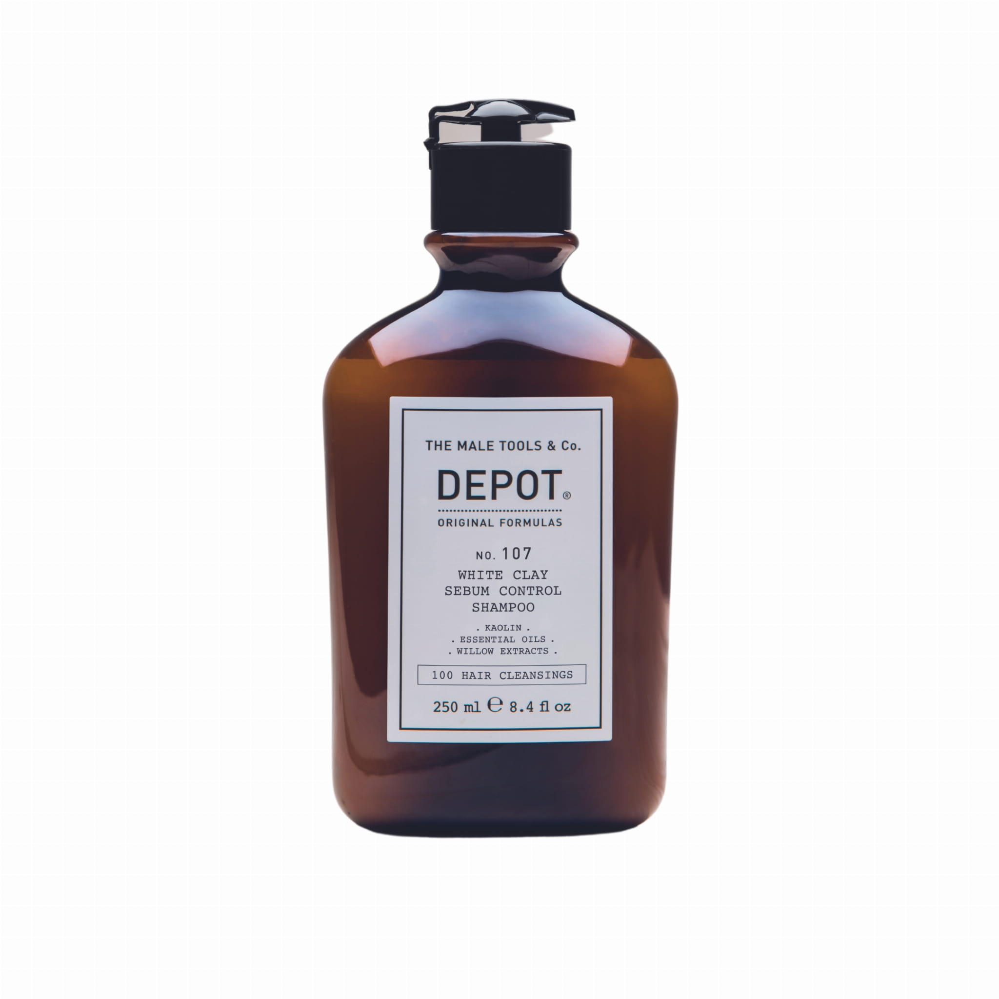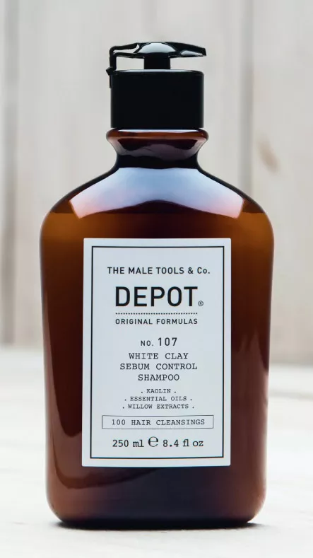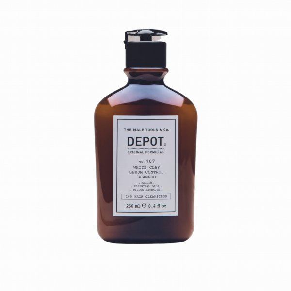 Szampon do włosów przetłuszczających się Depot No. 107 z białą glinką normalizuje pracę gruczołów łojowych i przywraca skórze głowy równowagę. Kosmetyk szybko rozwiązuje problem nadmiernego przetłuszczania i zapobiega jego powracaniu. Dodatkowo nawilża włosy i skórę głowy oraz działa odświeżająco. Pozostawia ponadto przyjemny zapach na włosach. Dzięki zawartości kory wierzby szampon działa również kojąco, ściągająco i tonizująco.