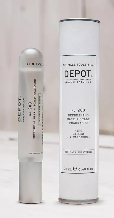 Potrzebujesz szybkiego odświeżenia włosów, a nie masz czasu na prysznic? Sięgnij po odświeżający spray do włosów Depot No. 203 w formie delikatnej mgiełki perfumowanej. Ten kosmetyk szybko neutralizuje nieprzyjemny zapach włosów i skóry głowy, a dodatkowo pozostawia zapach mięty, imbiru i kardamonu. Spray powstał na bazie alkoholu, który szybko się ulatnia, przez co włosy nie są mokre. Spray odświeża je, pozostawia przyjemny zapach i uczucie komfortu.