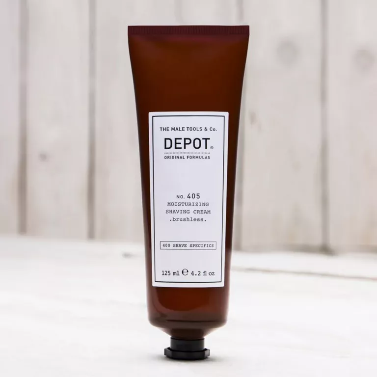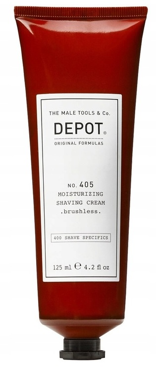 Krem do golenia Depot No. 405 nie wymaga stosowania pędzla. Kosmetyk gwarantuje płynne golenie oraz łagodzi podrażnienia. Kosmetyk przywraca skórze równowagę hydrolipidową po goleniu. W efekcie jest ona stonowana i elastyczna. W składzie znajdują się olej kokosowy i słodki olej migdałowy, które świetnie zmiękczają oraz odżywiają skórę. Natomiast sok z aloesu wzmacnia i regeneruje. Ponadto kosmetyk bazuje na kompleksie botanicznym, który składa się aż z 10 ekstraktów roślinnych o odżywczym działaniu.