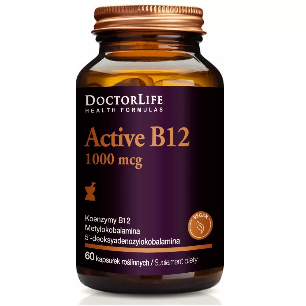 Doctor Life Active B12 to suplement diety zawierający aktywną formę witaminy B12 - metylokobalaminę. Każda kapsułka dostarcza aż 1000 mcg tej witaminy, co stanowi 40000% referencyjnej wartości spożycia. Metylokobalamina jest formą witaminy B12, która jest lepiej wchłaniana w porównaniu z innymi formami, takimi jak cyjanokobalamina. Produkt ten wspomaga układ nerwowy i komórki mózgowe, przyczynia się do redukcji zmęczenia oraz wspomaga prawidłową produkcję czerwonych krwinek i funkcjonowanie układu odpornościowego.