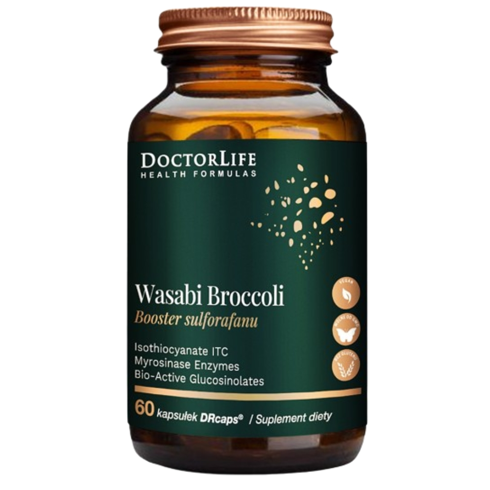 Doctor Life Broccoli & Wasabi zawiera glukorafaninę, bio-prekursor sulforafanu, który występuje w nasionach i kiełkach brokułów. Dzięki unikalnemu procesowi ochrony enzymu myrozynazy, glukorafanina jest skutecznie przekształcana do aktywnego sulforafanu w jelicie cienkim, co zwiększa efektywność suplementu.