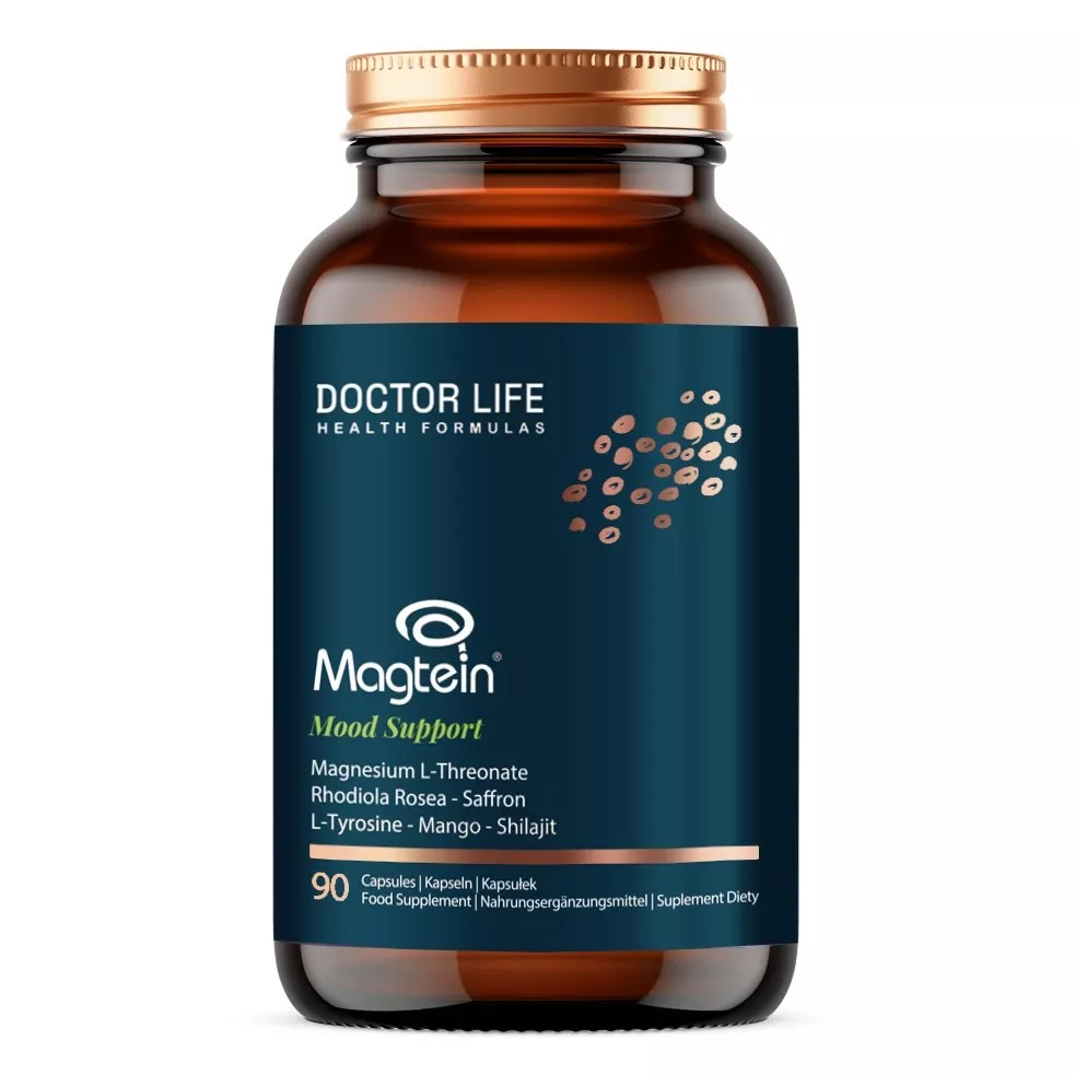 Doctor Life Magtein Mood Support zawiera unikalną formułę, która łączy L-treonian magnezu z ekstraktem z szafranu, różeńca górskiego, liści mango, mumio i L-tyrozyną. Ta kombinacja składników pomaga zachować spokój, skupienie i wspiera zdrowie psychiczne.