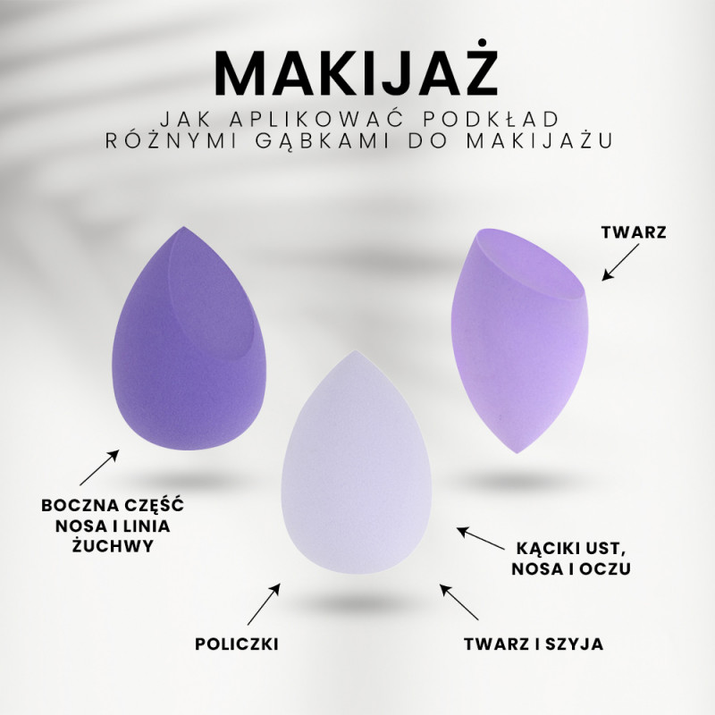 - 2 gąbki w kształcie łezki oraz 2 skośnie ścięte pod różnym kątem, co pozwala na różnorodne techniki aplikacji.