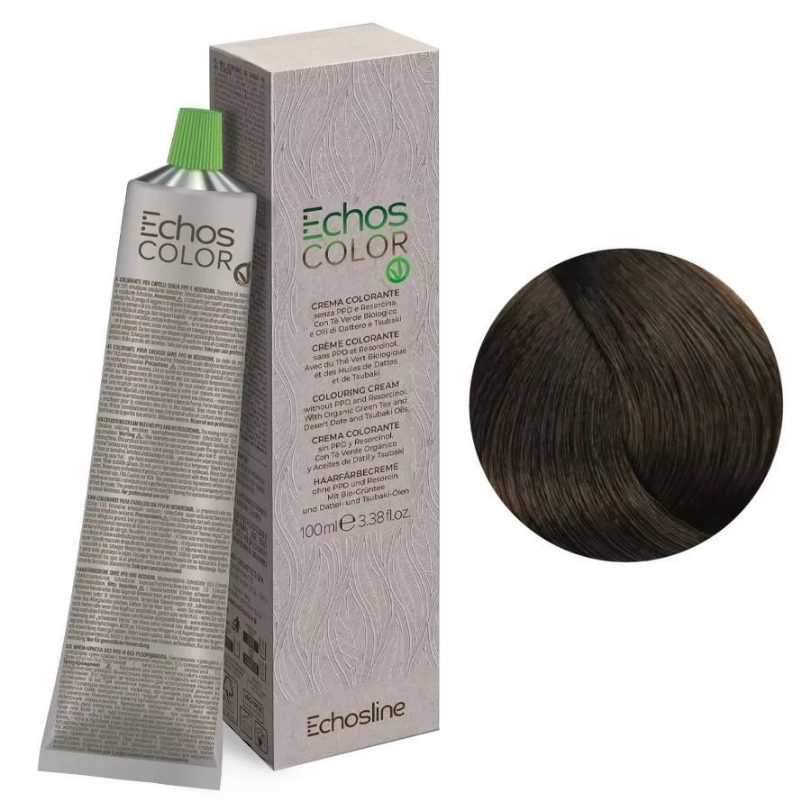 Farba Echosline Echoscolor oferuje naturalne, lśniące i żywe odcienie, które są zgodne z kolorami na próbnika. Dzięki nowej formule bez PPD i rezorcynolu, zapewnia idealne pokrycie siwych włosów oraz wierność odcieniom z palety.