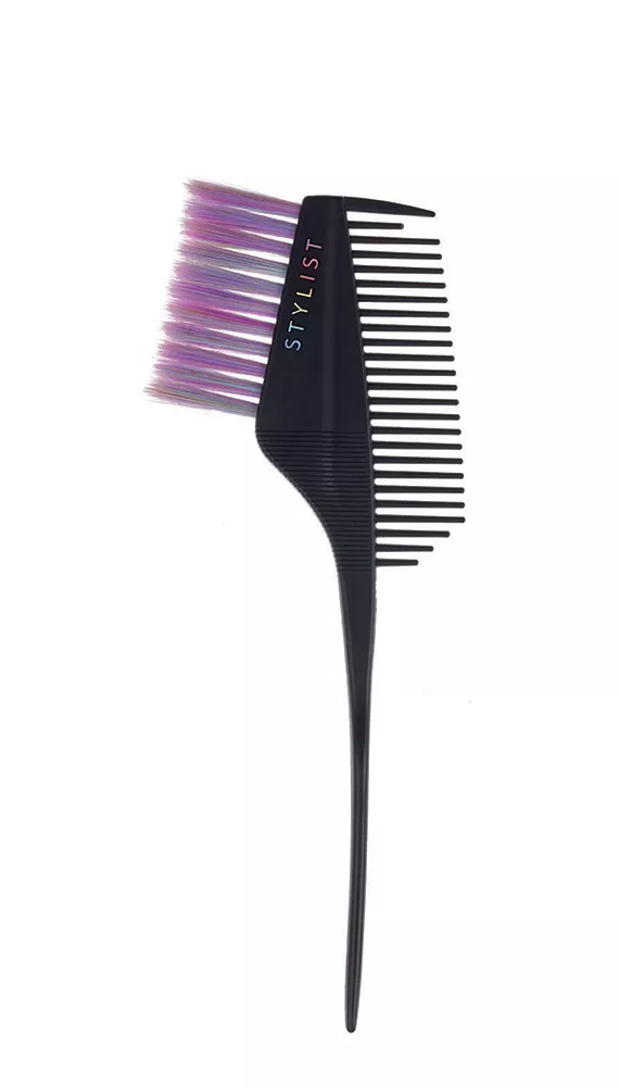 Profesjonalny pędzelek do nakładania farby na włosy Efalock Rainbow z serii Stylist to niezastąpione narzędzie podczas koloryzacji. Dzięki swojej lekkości i poręczności, pozwala szybko i równomiernie rozprowadzić mieszankę koloryzującą na włosach. Ten model charakteryzuje się wyjątkowym tęczowym włosiem wykonanym z tworzywa sztucznego, co dodaje mu unikalnego wyglądu. Pędzel jest wyposażony w praktyczny grzebień po jednej stronie oraz zakończony szpikulcem, który ułatwia dzielenie włosów na sekcje.