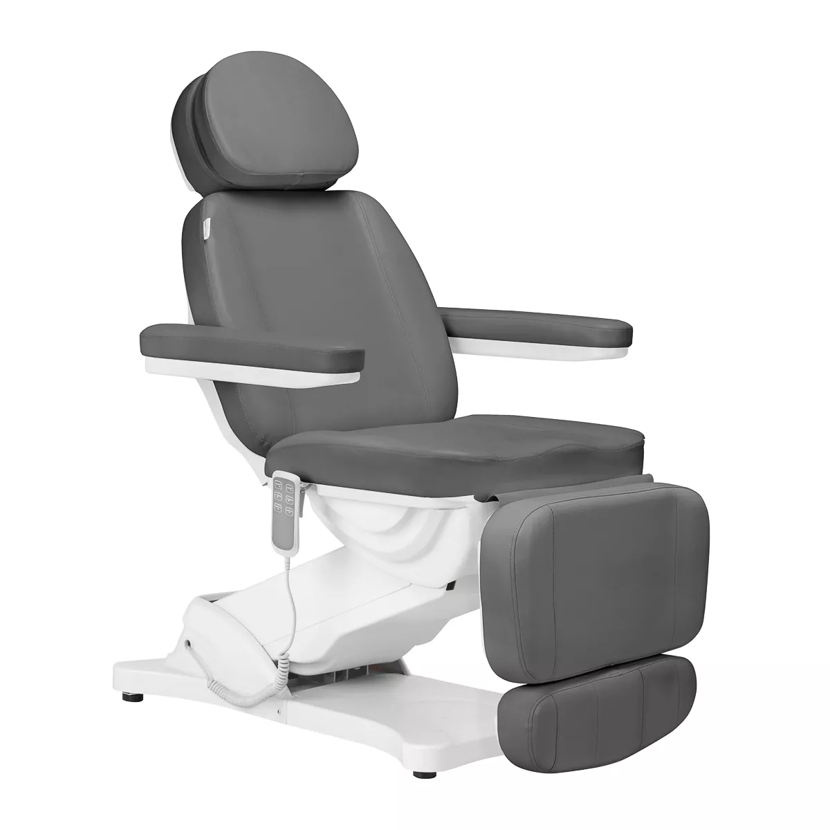 Fotel wypełniony jest wyprofilowaną pianką i pokryty przyjemną w dotyku skórą syntetyczną w odcieniach szarości. Użyty materiał sprawia, że sprzęt jest łatwy w czyszczeniu, a także odporny na wilgoć i wybrane środki dezynfekcji. Solidna podstawa wykonana z trwałego materiału w odcieniach bieli zapewnia stabilność w trakcie zabiegów. Odpowiednio wyprofilowane obszycia nadają fotelowi stylowy wygląd i sprawiają, że siedzisko jest ergonomiczne. Minimalistyczny, prosty design i klasyczna kolorystyka pozwalają mu wpasować się w każde wnętrze.
