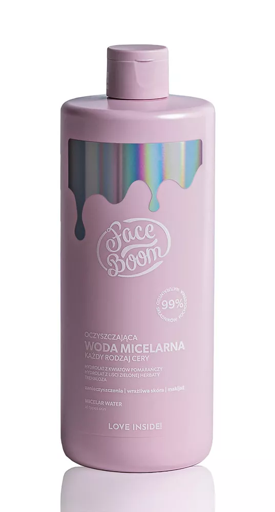 Woda micelarna FaceBoom to idealny sposób na oczyszczanie każdego rodzaju cery. Ten naturalny kosmetyk oparty na wegańskiej formule zmywa makijaż i zanieczyszczenia, dokładnie oczyszcza skórę, a ponadto przynosi przyjemne uczucie odświeżenia. Skóra jest gładka, świeża, czysta i gotowa na dalsze zabiegi pielęgnacyjne. W składzie znajdują się hydrolaty roślinne, które idealnie zadbają o Twoją cerę. Nie ma tam natomiast PEG, parabenów, SLS, olejów mineralnych. Woda micelarna FaceBoom jest odpowiednia dla każdego typu skóry, może być stosowana również w pielęgnacji cery wrażliwej.