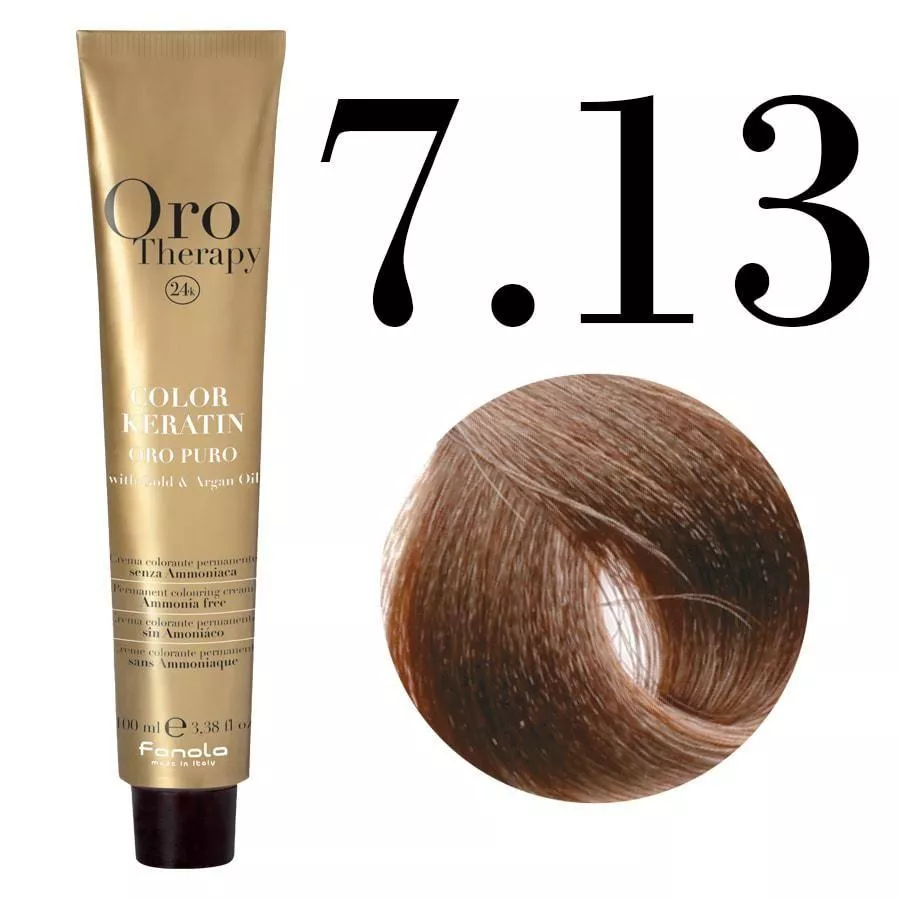 Poznaj Fanola Oro Therapy Color Keratin w odcieniu 7.13 – profesjonalną farbę do trwałej koloryzacji bez amoniaku, która oferuje innowacyjne połączenie pielęgnacji i intensywnego koloru. Dzięki zaawansowanej formule z keratyną, złotem oraz olejkiem arganowym, Twoje włosy zyskają głęboki, trwały odcień oraz wyjątkową ochronę i blask, bez ryzyka podrażnień. Produkt stworzony z myślą o wymagających klientach i profesjonalistach.