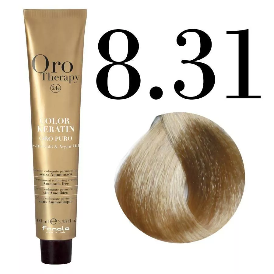 Fanola Oro Therapy Color Keratin 8.31 to profesjonalna farba do włosów bez amoniaku, która gwarantuje efektowną i bezpieczną koloryzację, dbając jednocześnie o kondycję Twoich włosów. Postaw na luksusowy blask, intensywny kolor i zdrowe, jedwabiście miękkie włosy – wybierz Fanola Oro Therapy Color Keratin i ciesz się piękną fryzurą na dłużej!