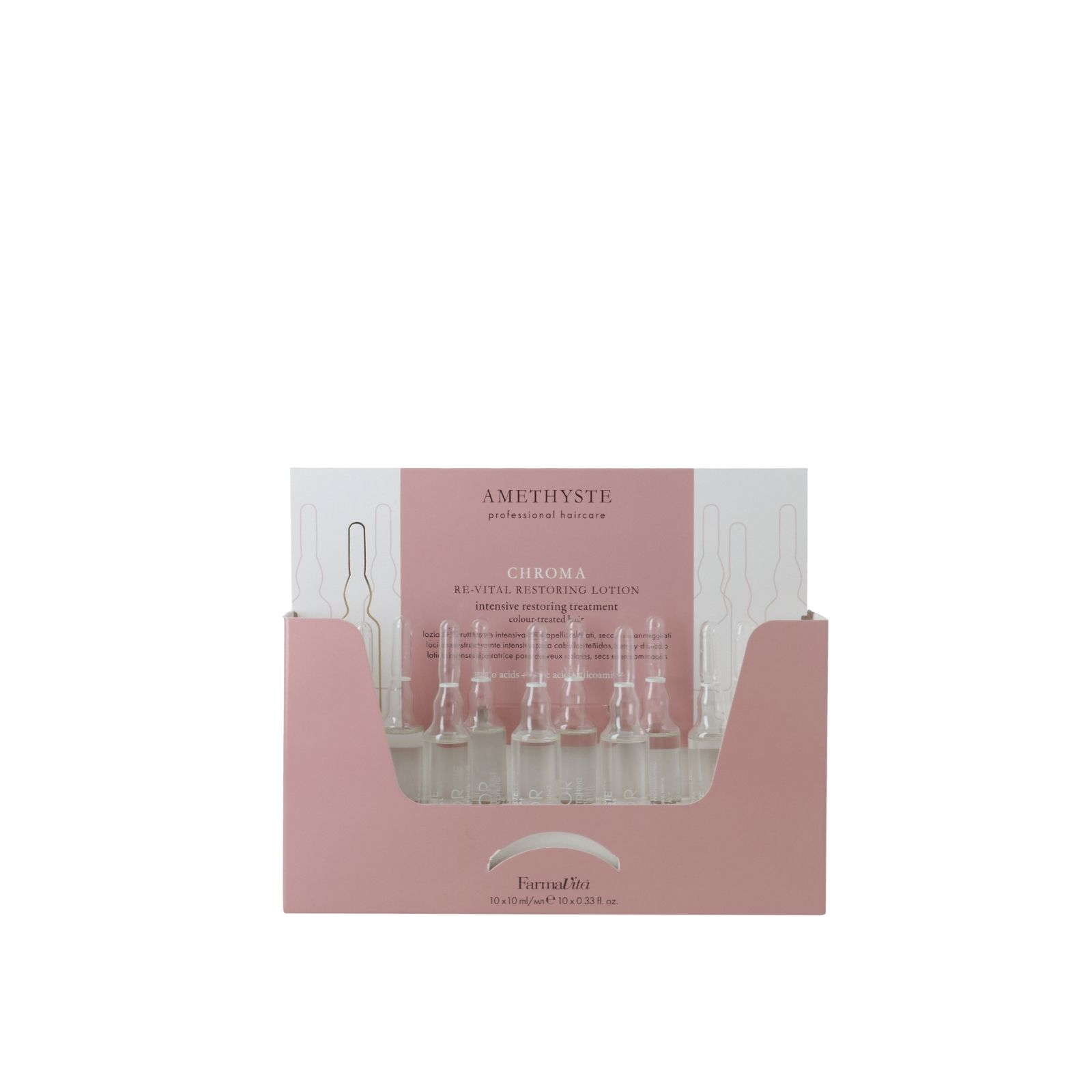 Poznaj Farmavita Amethyste Chroma Re-vital – profesjonalny lotion odbudowujący do włosów farbowanych, który zapewnia intensywną regenerację i długotrwałą ochronę koloru. Każde opakowanie zawiera 10 wygodnych ampułek po 10 ml, idealnych do precyzyjnej i skutecznej kuracji w domu lub salonie fryzjerskim. Dzięki innowacyjnej formule z aminokwasami, kwasem mlekowym i glikoaminą, Twoje włosy zyskają olśniewający blask, siłę oraz żywy, promienny kolor na dłużej.