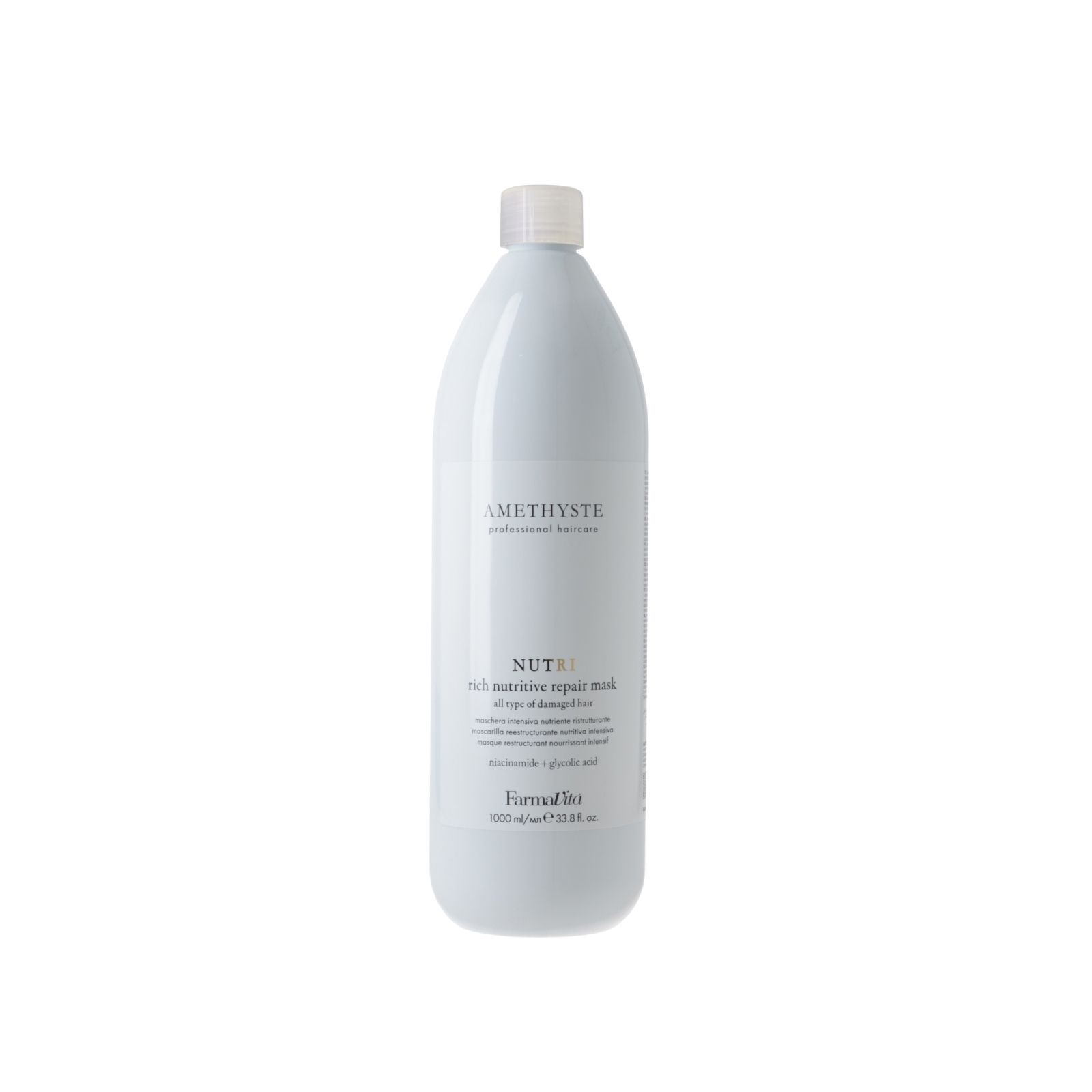 Odkryj profesjonalną pielęgnację włosów z maską Farmavita Amethyste Nutri Rich Nutritive Repair Mask 1000ml – intensywnie odżywczą maską stworzoną z myślą o głębokiej regeneracji i odbudowie nawet bardzo zniszczonych włosów. Dzięki zaawansowanej formule z niacynamidem i kwasem glikolowym zadbasz o swoje włosy jak w salonie fryzjerskim, przywracając im naturalną miękkość, blask i zdrowy wygląd.