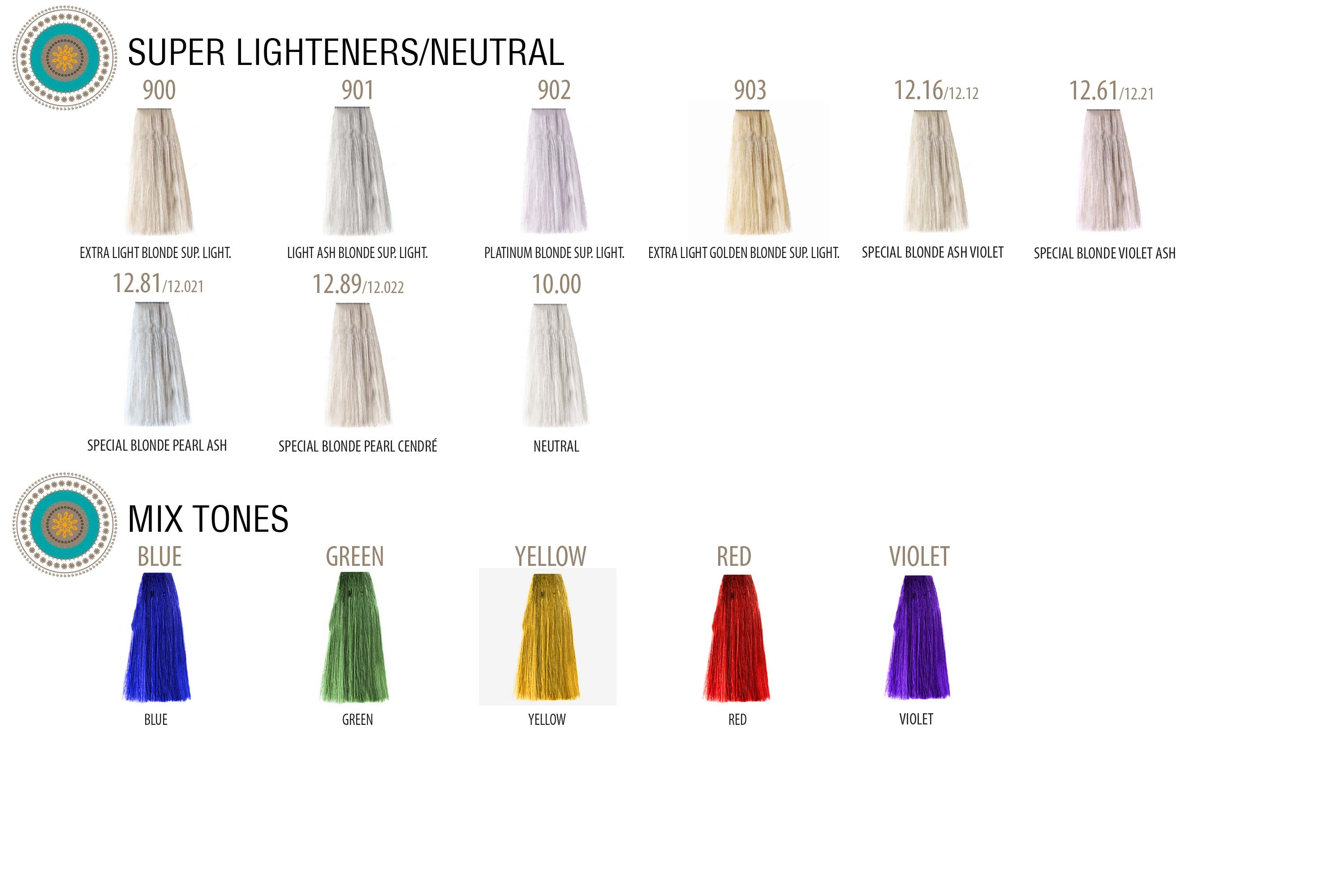 - Możliwość tworzenia nieskończonych kombinacji kolorystycznych dzięki szerokiej palecie odcieni: Natural, Intense Natural, Warm and Cool, Ash, Golden, Brown, Beige, Red, Purple, Superlightener oraz Special Mix.