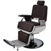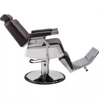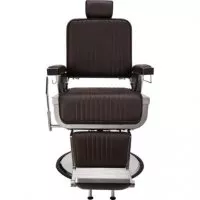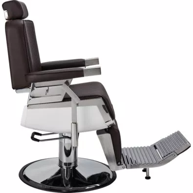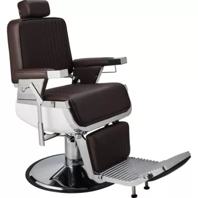 Fotel barberski LORD to fotel do nowoczesnego barbershopu i jednocześnie jeden z naszych najwygodniejszych modeli z oferty. Elegancka biała obudowa siedziska, delikatna metalowa chromowana rama w srebrnym kolorze, tapicerka w pięknym brązowym odcieniu i pionowe przeszycia nadają mu niepowtarzalnego charakteru.