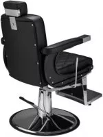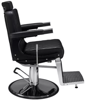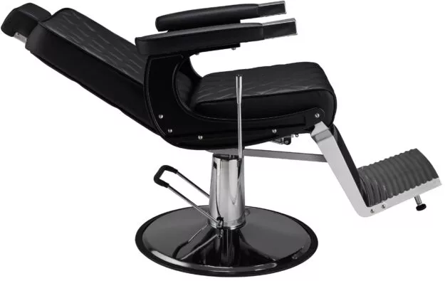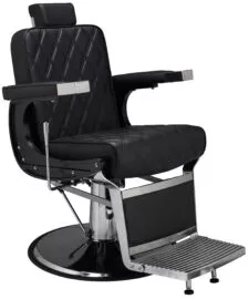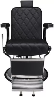 Fotel barberski DUKE z bryłą inspirowaną kultowym fotelem Ayala Stig. Czarna, metalowa obudowa siedziska w połączeniu z metalowymi wstawkami w kolorze srebrnym i tapicerka pikowana w romby wygląda świetnie.