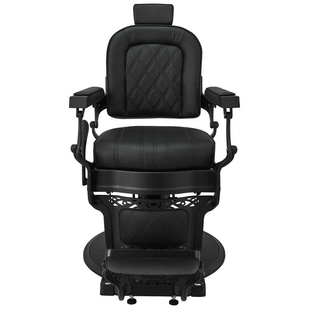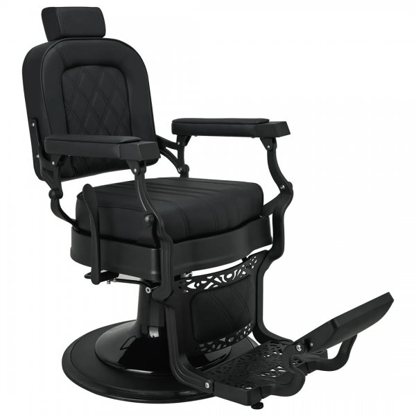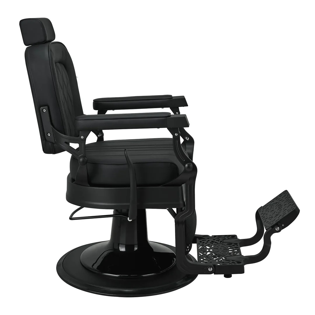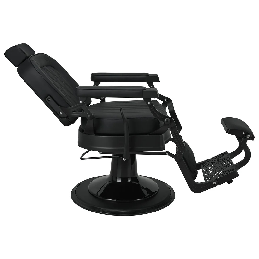 Czarna, matowa tapicerka z efektownymi przeszyciami doskonale współgra z satynowym wykończeniem ramy, podkreślając jego premiumowy charakter. Ażurowe detale oraz uchwyt na zagłówek podkreślają dbałość o szczegóły i funkcjonalność. Szerokie, komfortowe siedzisko, regulowany zagłówek, obracany podnóżek oraz możliwość rozłożenia do pozycji półleżącej pozwalaja łatwo dopasować fotel do każdej sylwetki, gwarantując siedzącemu najwyższy komfort użytkowania, a barberowi pełną swobodę pracy.