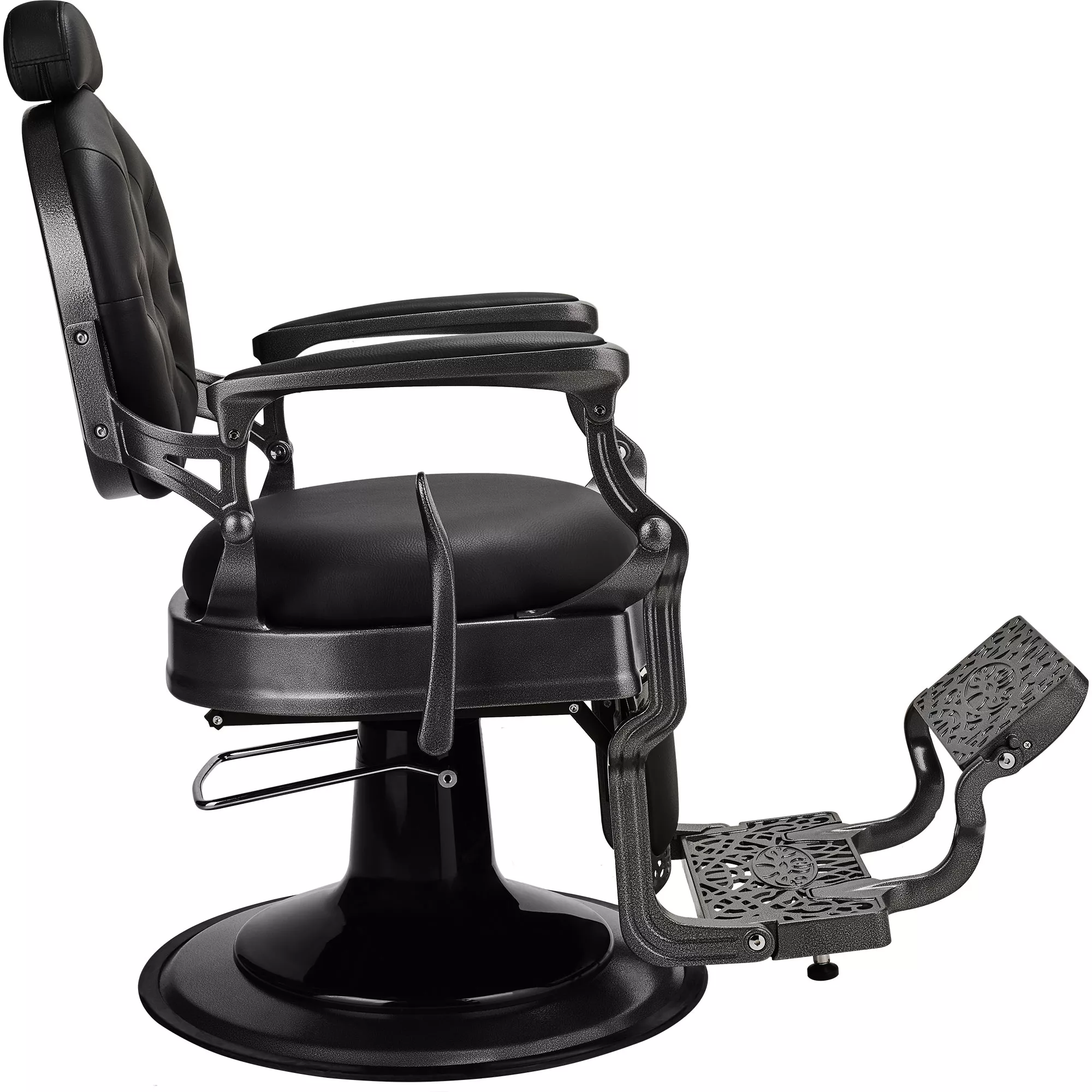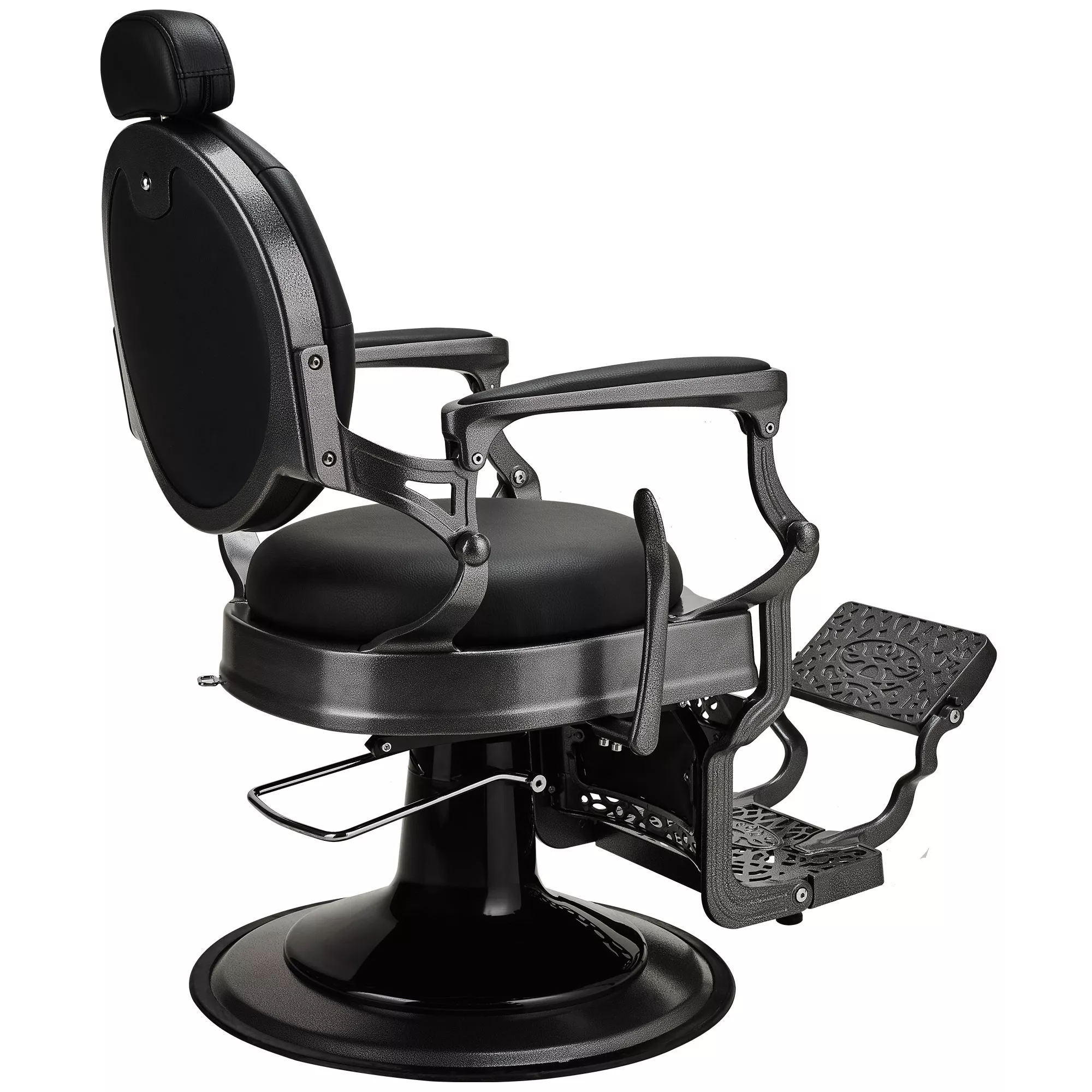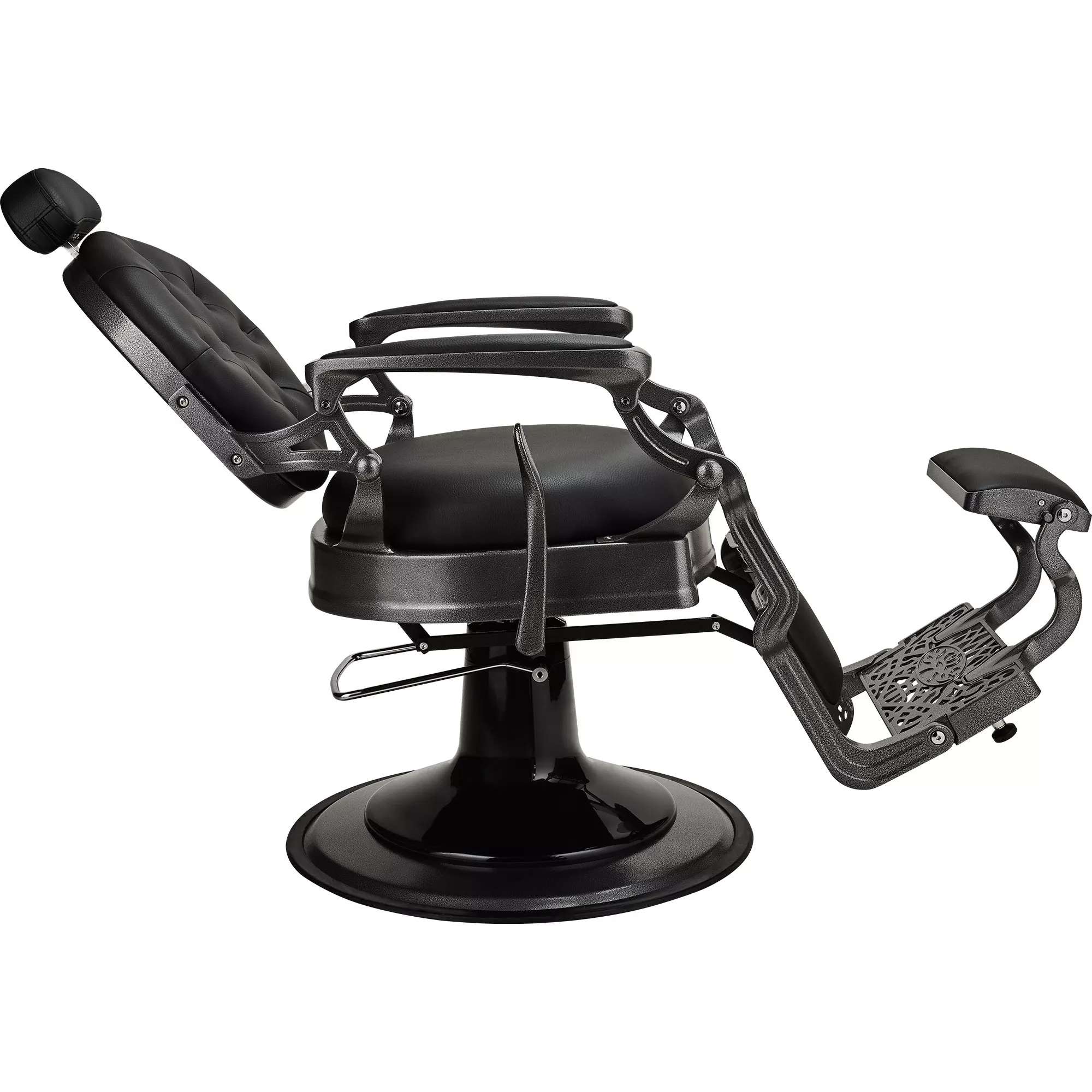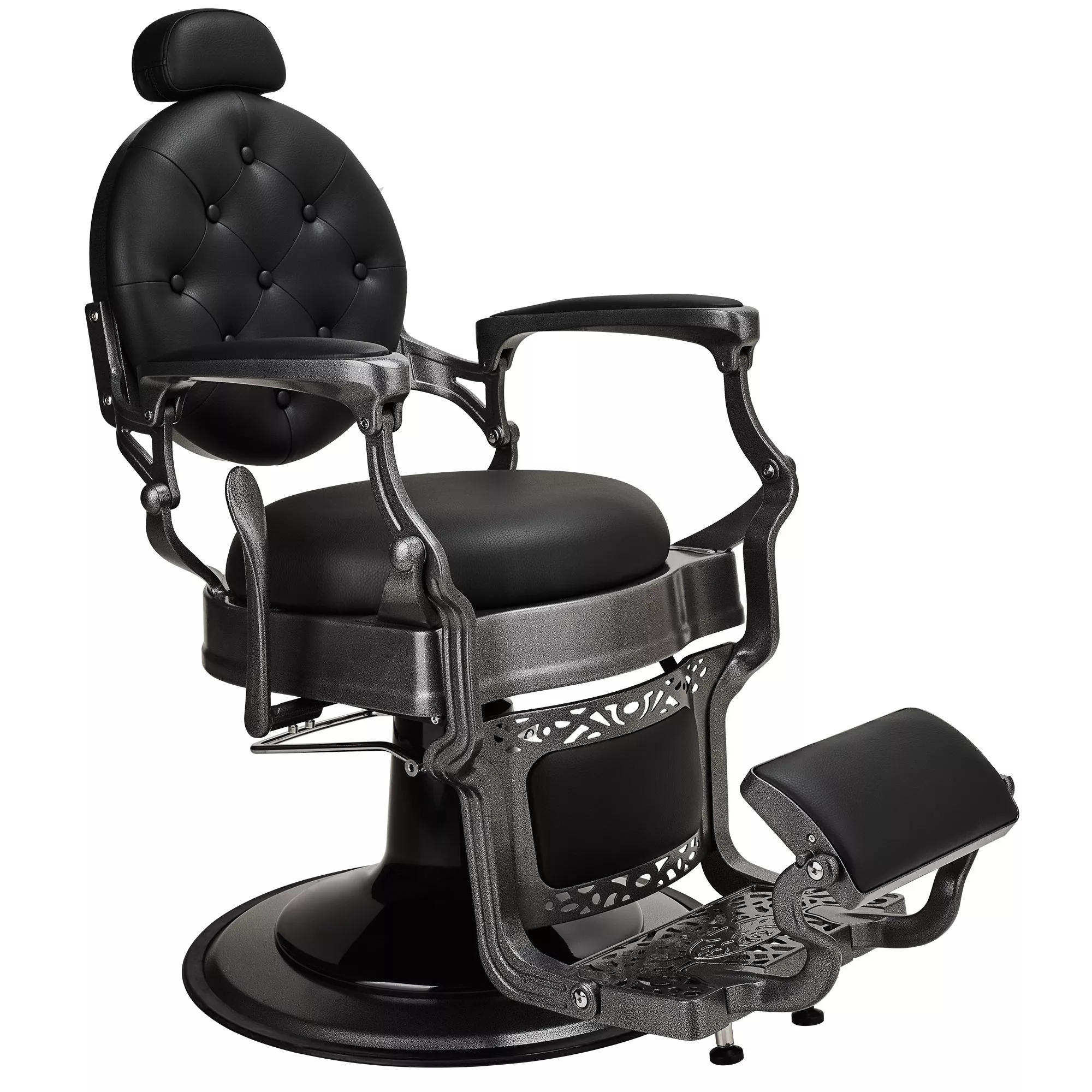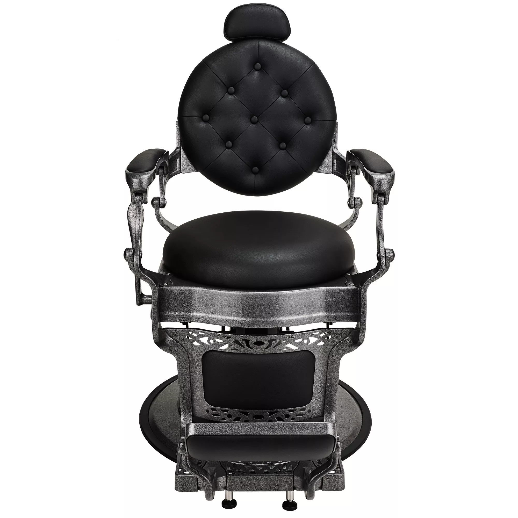 Fotel barberski TOMMY to kolejny model w naszej ofercie nawiązujący formą do klasycyzmu Ludwika XVI. Stelaż w kolorze stalowo-grafitowym z porowatą strukturą, ażurowy podnóżek i czarna tapicerka z pikowanym oparciem sprawia, że fotel wygląda bardzo efektownie. zarówno klasyczne i eleganckie, jak również w te nowoczesne i industrialne.
