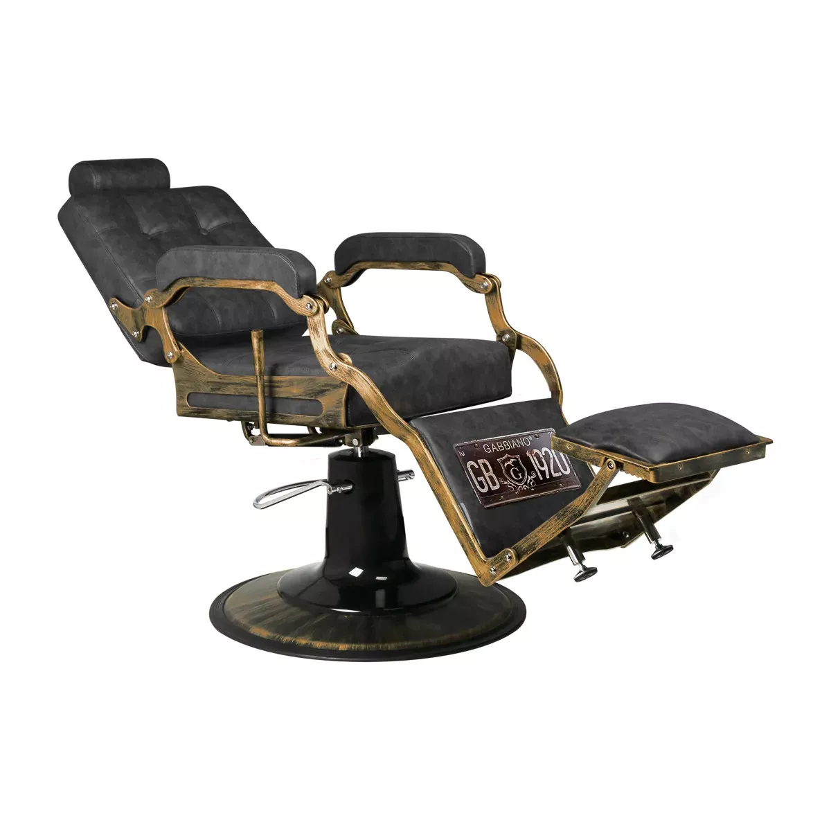 Fotel barberski w stylu retro zachwyca eleganckim designem inspirowanym klasyką motoryzacji. Solidna, okrągła podstawa zapewnia stabilność oraz komfort użytkowania. Siedzisko wypełnione trwałą, odporną na odkształcenia pianką oraz obite przyjemną w dotyku skórą syntetyczną gwarantuje wygodę i wytrzymałość na lata. Zastosowane materiały sprawiają również, że sprzęt jest odporny na wilgoć oraz łatwy do czyszczenia. Pikowana tapicerka w odcieniu czerni, wykonana z dbałością o detale, podkreśla luksusowy charakter mebla. Stylizowane metalowe podłokietniki i rama w odcieniu postarzanego złota nadają całości wyjątkowego charakteru.