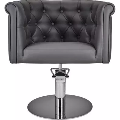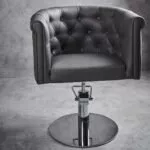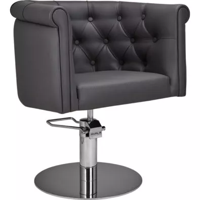 Półokrągłe oparcie. Tapicerka do wyboru w jednym z kilkudziesięciu kolorów skaju z naszej oferty. Oparcie pikowanie tapicerowanymi guzikami. Otwór w siedzisku ułatwiający czyszczenia. Pompa hydrauliczna w standardzie. Możliwość wyboru podnóżka w kolorze czarnym, złotym lub srebrnym za dopłatą