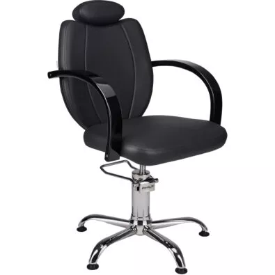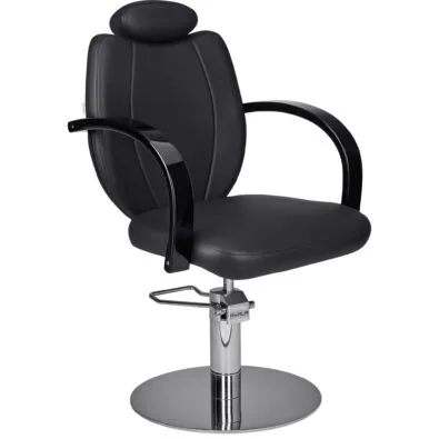 Fotel TOLEDO w czarnej, matowej tapicerce z drewnianymi podłokietnikami lakierowanymi na czarny połysk. Z zagłówkiem, dzięki któremu może być użytkowany jako fotel barberski. Na pompie hydraulicznej i na podstawie do wyboru.