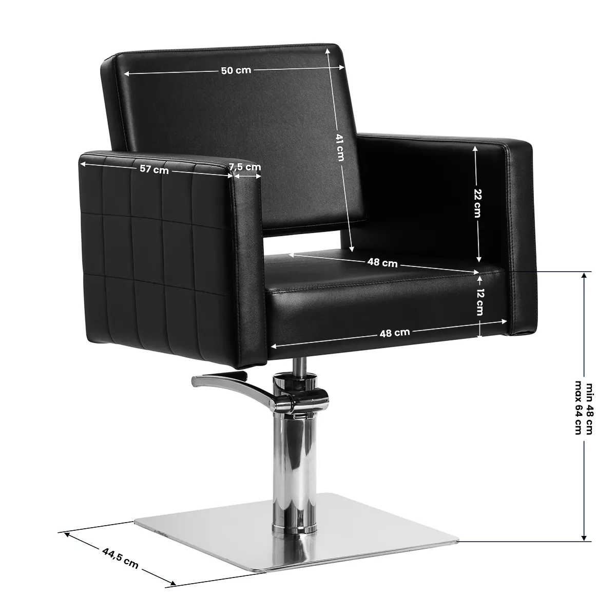 Solidna, płaska podstawa w kształcie kwadratu zapewnia stabilność w trakcie użytkowania. Gładka powierzchnia o lustrzanym wykończeniu nadaje elementowi elegancki wygląd i sprawia, że ten jest łatwy do utrzymania w czystości. Wygodne siedzisko wypełnione trwałą pianką zapewnia wysoki komfort użytkowania, nawet podczas wielogodzinnych zabiegów. Obite skórą syntetyczną podłokietniki z ozdobnymi przeszyciami są ciekawym wizualnie elementem, a co ważniejsze, pozwalają na prawidłowe ułożenie barków klienta. Sprawia to, że nie chowa on głowy w ramionach ani się nie garbi – wyraźnie ułatwia to wykonywanie precyzyjnych zabiegów, w tym strzyżenia. Wyposażenie fotela w mechanizm pełnego obrotu sprawia, że praca fryzjera staje się bardziej efektywna i wygodna.