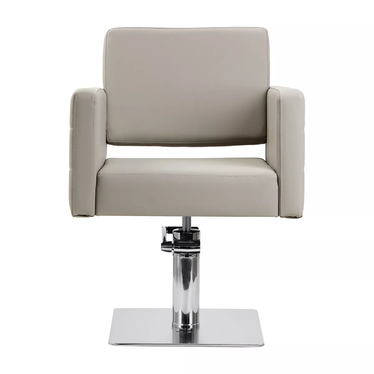 Solidna, płaska podstawa w kształcie kwadratu zapewnia stabilność w trakcie użytkowania. Gładka powierzchnia o lustrzanym wykończeniu nadaje elementowi elegancki wygląd i sprawia, że ten jest łatwy do utrzymania w czystości. Wygodne siedzisko wypełnione trwałą pianką zapewnia wysoki komfort użytkowania, nawet podczas wielogodzinnych zabiegów. Obite skórą syntetyczną podłokietniki z ozdobnymi przeszyciami są ciekawym wizualnie elementem, a co ważniejsze, pozwalają na prawidłowe ułożenie barków klienta. Sprawia to, że nie chowa on głowy w ramionach ani się nie garbi – wyraźnie ułatwia to wykonywanie precyzyjnych zabiegów, w tym strzyżenia. Wyposażenie fotela w mechanizm pełnego obrotu sprawia, że praca fryzjera staje się bardziej efektywna i wygodna.