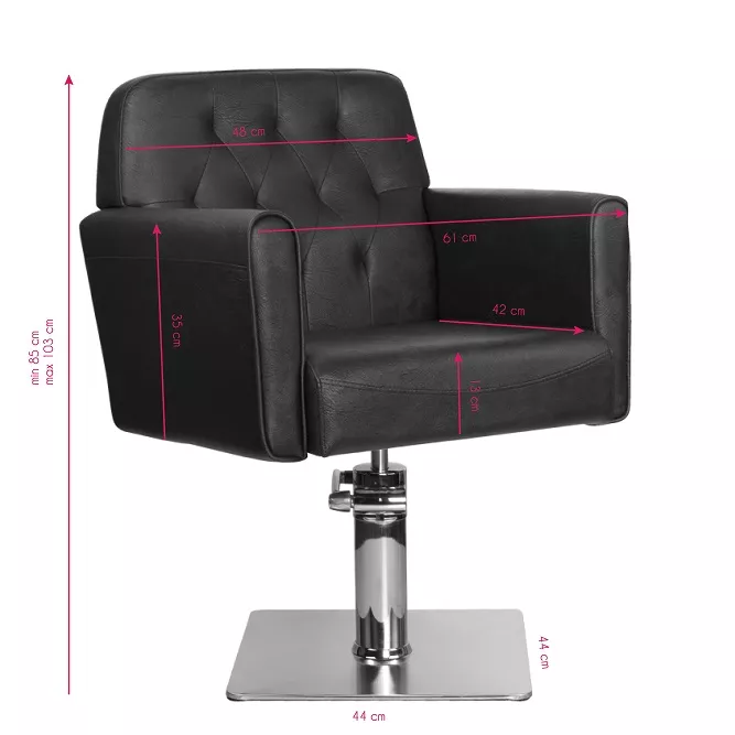Dokładne wymiary fotela są widoczne na jednym ze zdjęć produktu. Zapewniają one pełen komfort zarówno dla klienta, jak i fryzjera.