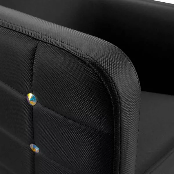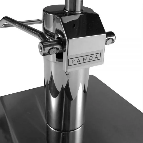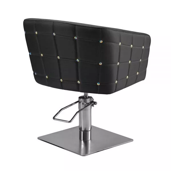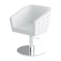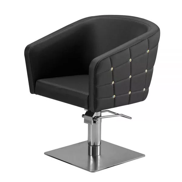 Fotel fryzjerski z wygodnym oparciem, osadzony na gustownej chromowanej kolumnie hydraulicznej z kwadratową podstawą. Siedzisko profilowane ergonomicznie.