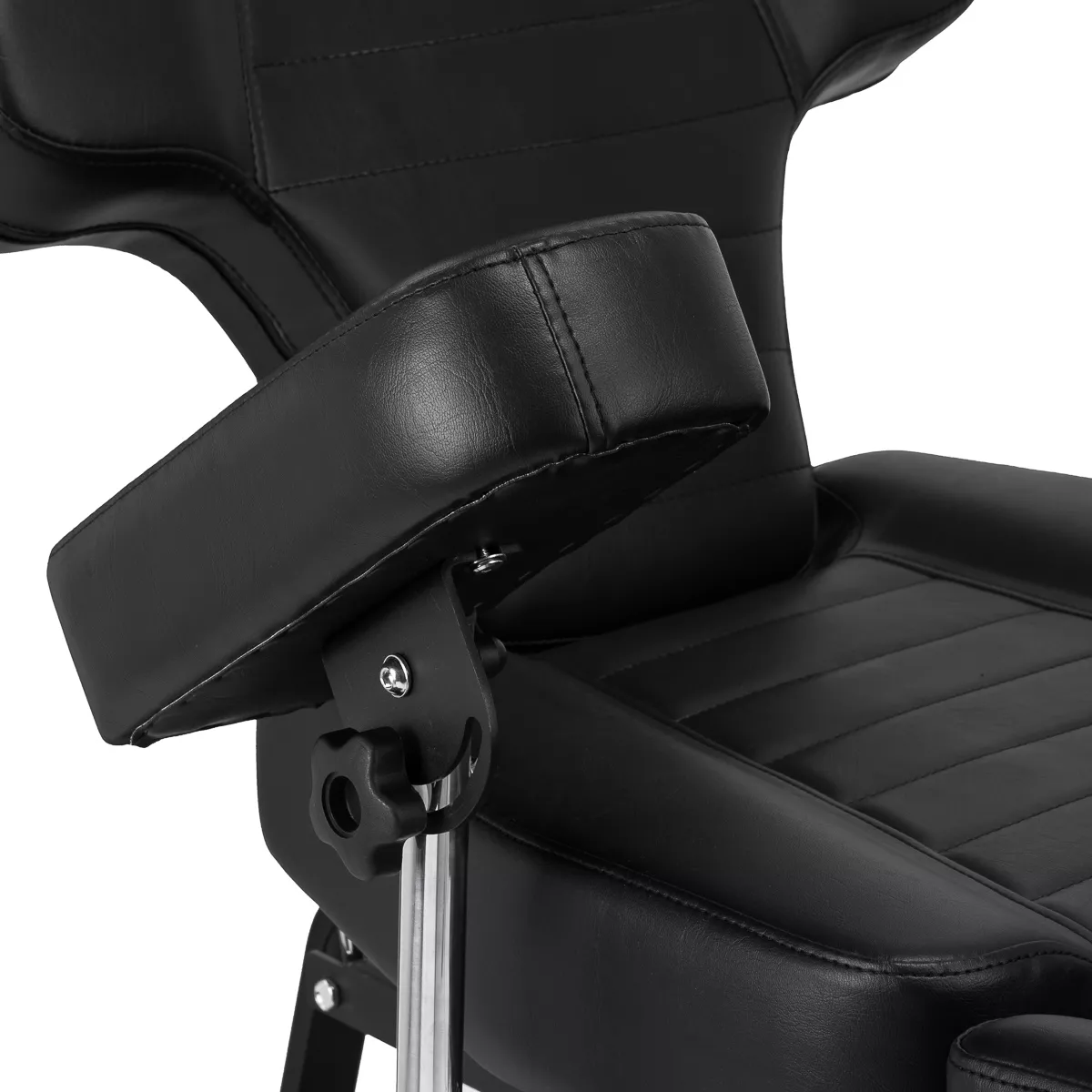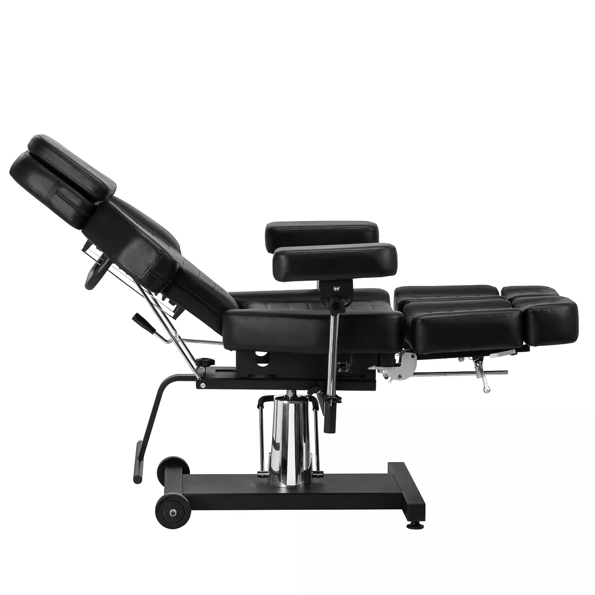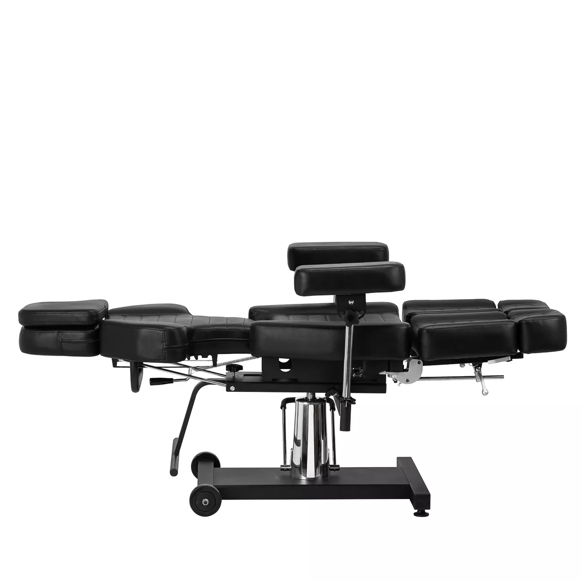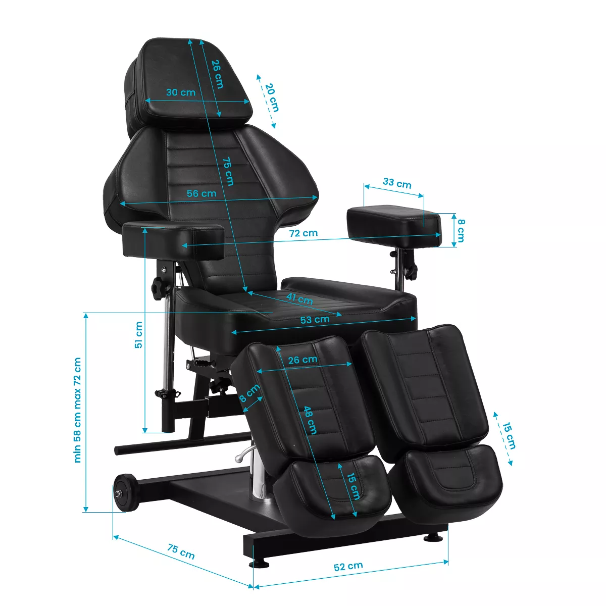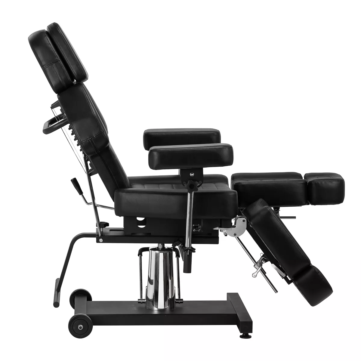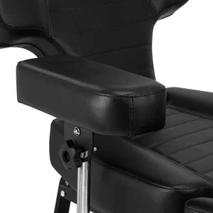 Wysokość siedziska regulowana jest za pomocą siłownika hydraulicznego w zakresie 58-72 cm, a przy pełnym rozłożeniu osiąga 210 cm. Kąt nachylenia oparcia i podnóżków można regulować manualnie. Dzielony podnóżek pozwala na niezależne ułożenie nóg, co znacząco zwiększa komfort podczas wykonywania zabiegów i daje większe możliwości – dodatkowo można je regulować na boki. Kolejnym atutem jest możliwość wysunięcia podnóżka, co gwarantuje stabilne podparcie także dla wyższych użytkowników. Podłokietniki są łatwe do zdemontowania i oferują szerokie możliwości regulacji wysokości oraz ułożenia. Wszystkie te rozwiązania zapewniają wysoki komfort pracy, wygodę klienta i pełne dopasowanie do specyfiki pracy w studiu tatuażu.