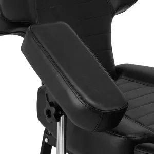 Minimalistyczny wygląd oraz klasyczna kolorystyka sprawiają, że fotel idealnie wpisuje się w estetykę salonów tatuażu, jednocześnie zwiększając efektywność pracy. Ergonomiczne wyprofilowanie i odporna na odkształcenia pianka zapewniają komfortową pozycję podczas sesji zarówno osobie tatuowanej, jak i artyście. Obicie z wysokiej jakości skóry syntetycznej w odcieniach czerni oraz stabilna podstawa gwarantują trwałość, komfort użytkowania i łatwe utrzymanie czystości. Funkcjonalna konstrukcja fotela oferuje szerokie możliwości dostosowania, co przekłada się na wysoki komfort pracy. Dodatkowo koła umieszczone w jednej części podstawy ułatwiają jego przestawianie.