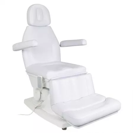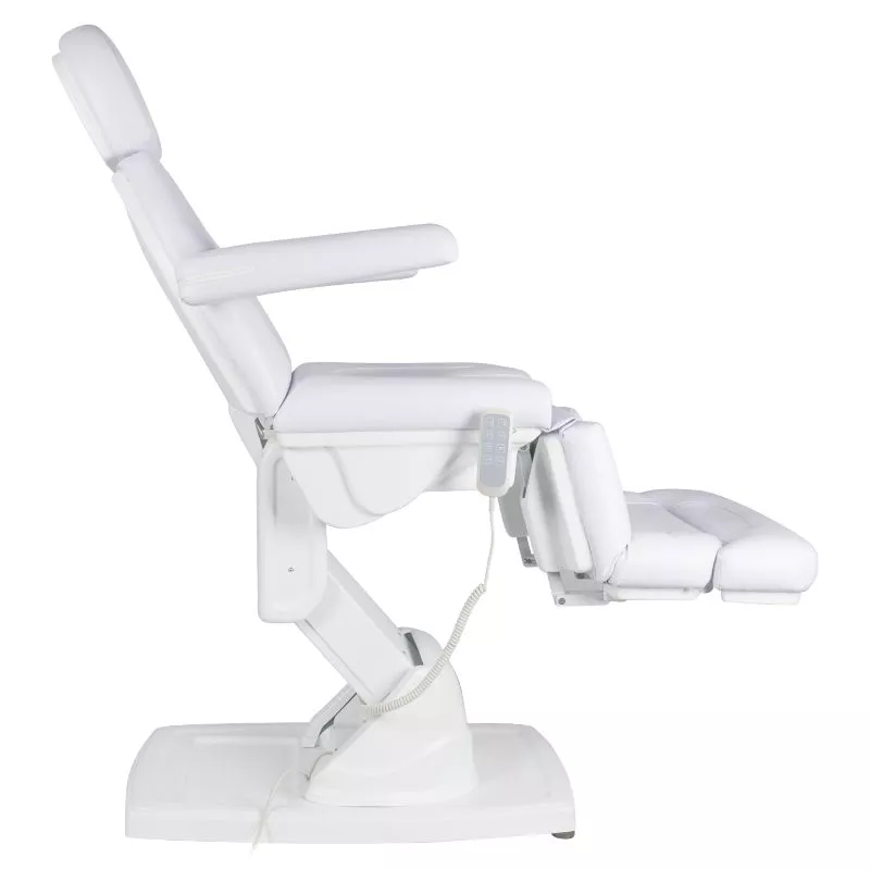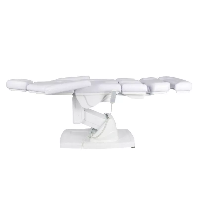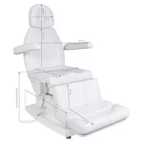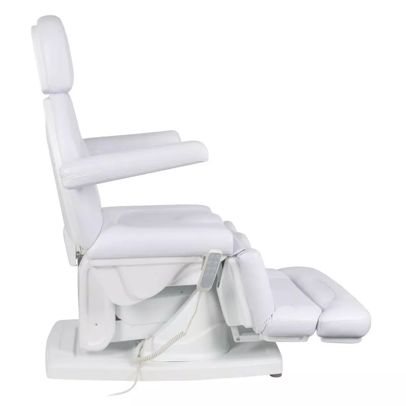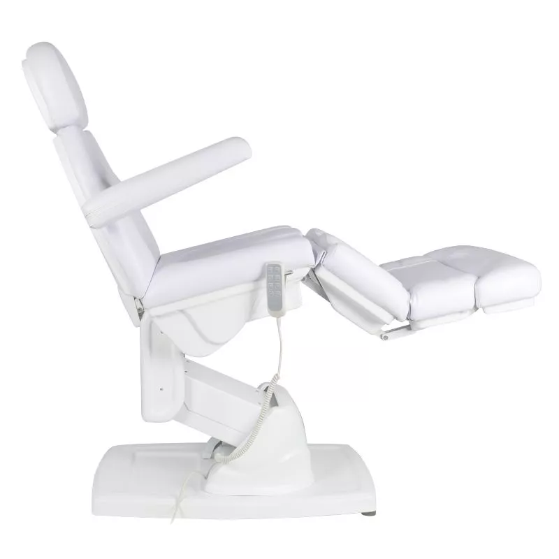 Specjalnie zaprojektowany podnóżek znacząco ułatwia wykonywanie zabiegów pedicure i podologicznych. Jest szeroki i stabilny, a dzięki elektrycznej regulacji pilotem można płynnie ustawiać jego kąt nachylenia. Takie rozwiązanie pozwala na wygodne podparcie nóg oraz ich odpowiednie ułożenie w różnych pozycjach, co zwiększa komfort zarówno klienta, jak i osoby wykonującej zabieg. Możliwość wysunięcia podnóżka sprawia, że fotel doskonale dopasowuje się także do wyższych użytkowników, zapewniając im właściwe podparcie. Dzięki możliwości odczepienia końcowej części podnóżka specjalista zyskuje pełną swobodę dostępu do stóp i palców, większą wygodę oraz precyzję podczas wymagających zabiegów. Przy maksymalnym podniesieniu siedziska, wyprostowanym podnóżku i odchylonej kołysce jego wysokość wynosi około 120 cm, co dodatkowo ułatwia precyzyjną pracę przy specjalistycznych zabiegach podologicznych.